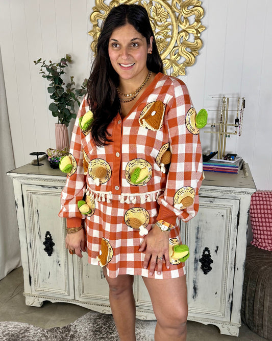 Queen of Sparkles Orange Checkered Thanksgiving Food Cardigan