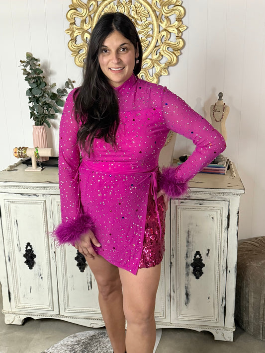 Queen of Sparkles Pink Feather & Rhinestone Sequin Short Romper