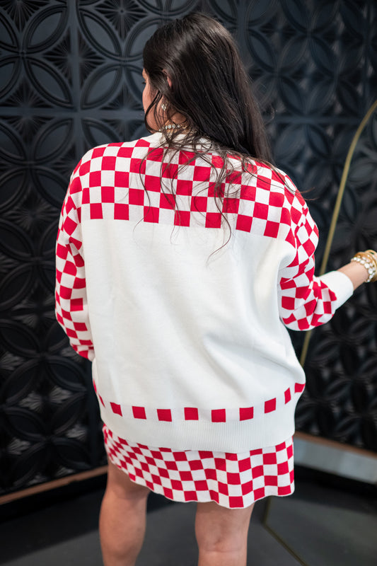 Queen of Sparkles Red & White Checkered Pizza & Wine Sweater