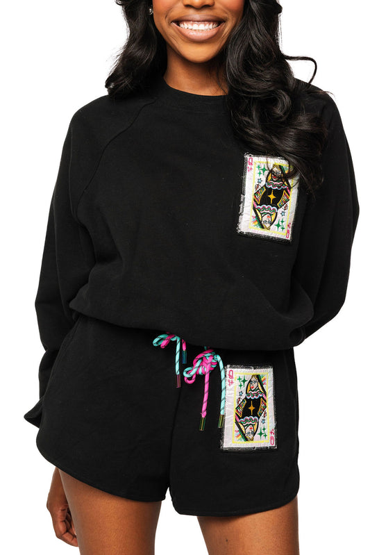Queen of Sparkles Black QOS Card Rhinestone Tie Sweatshirt