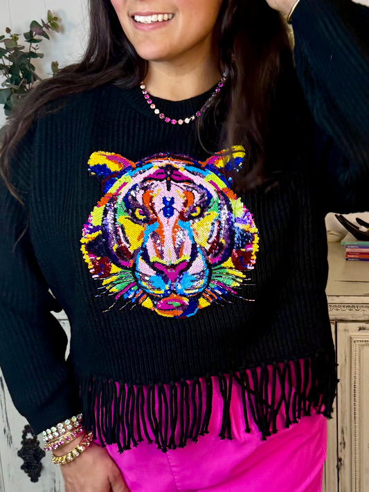 Queen of Sparkles Black Fringe Sweater with Rainbow Tiger
