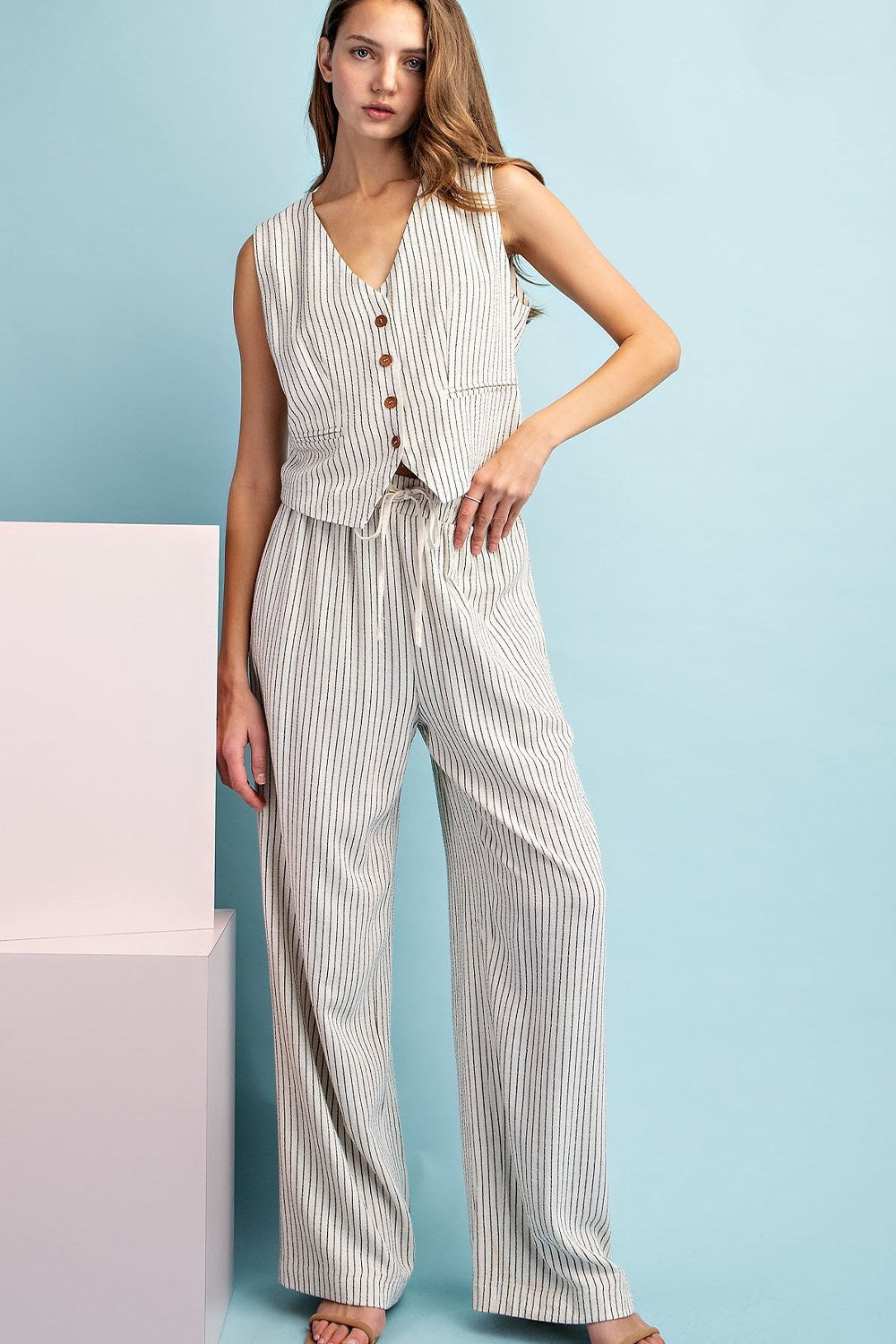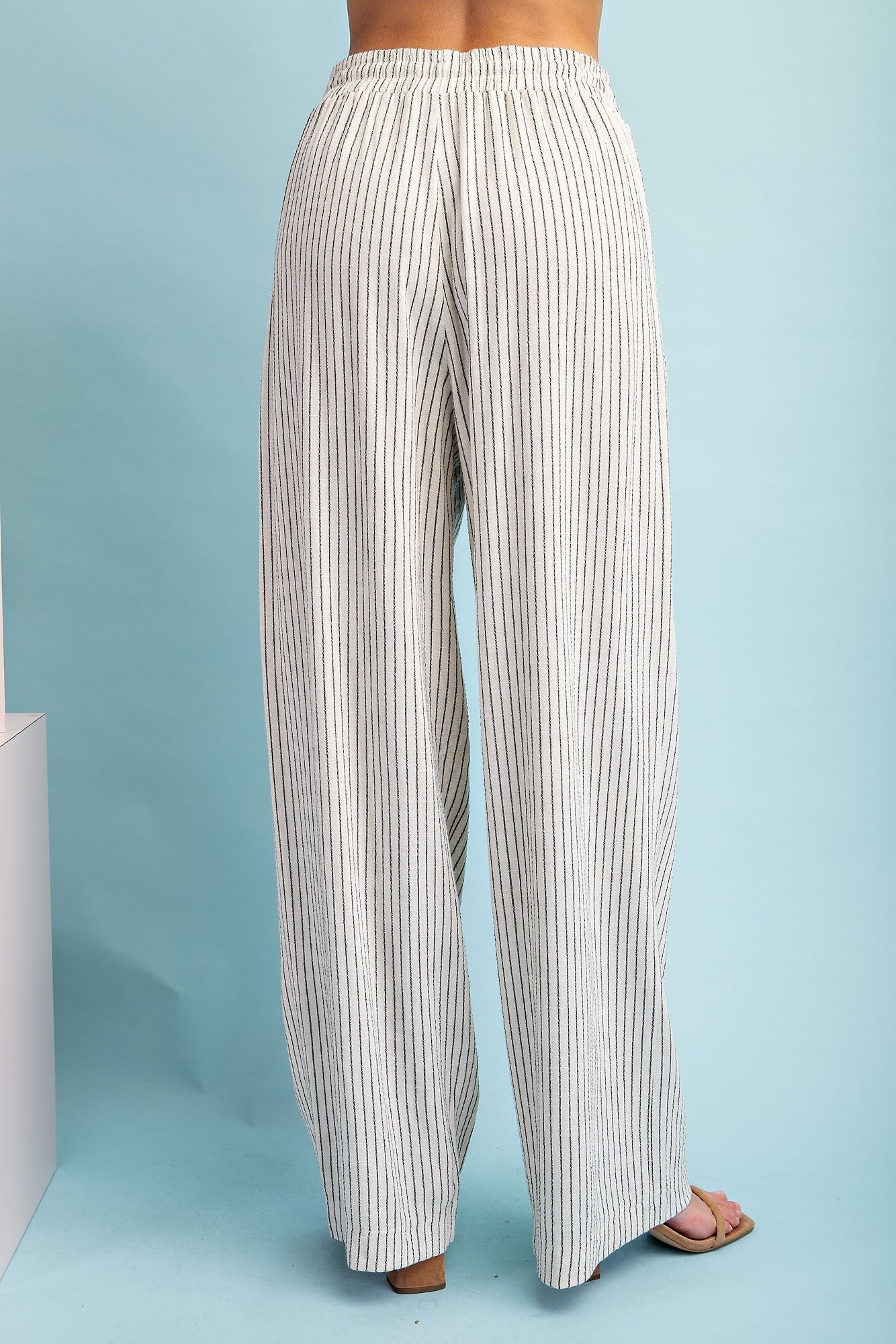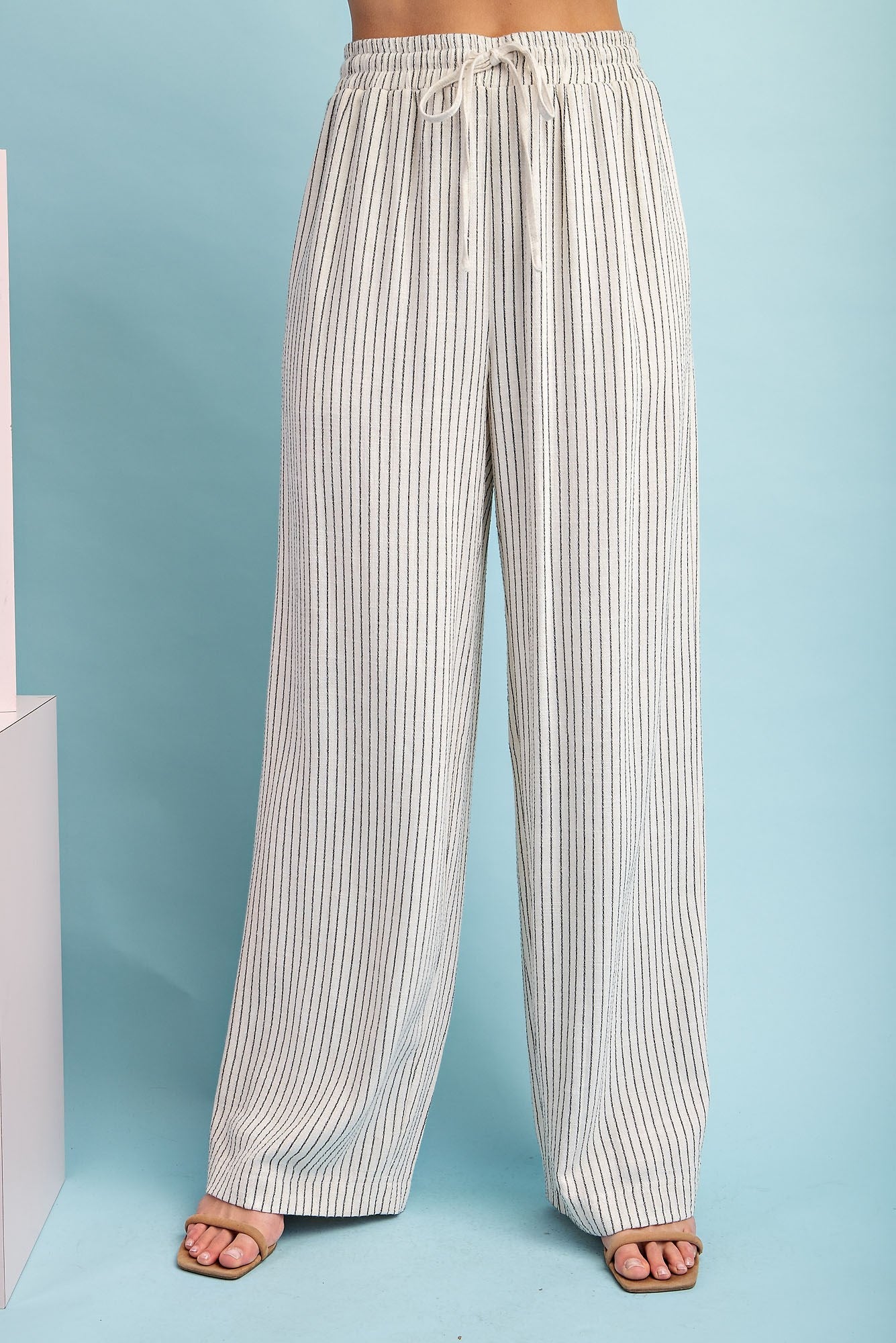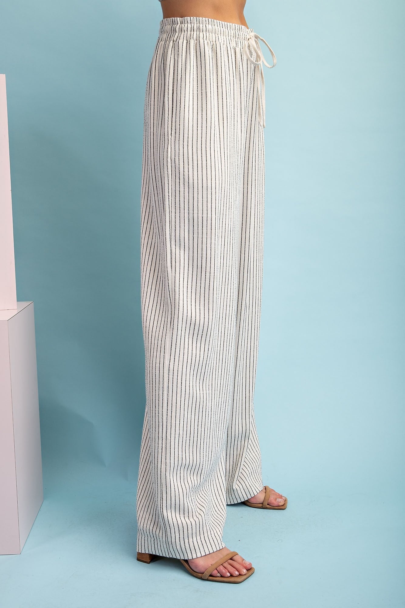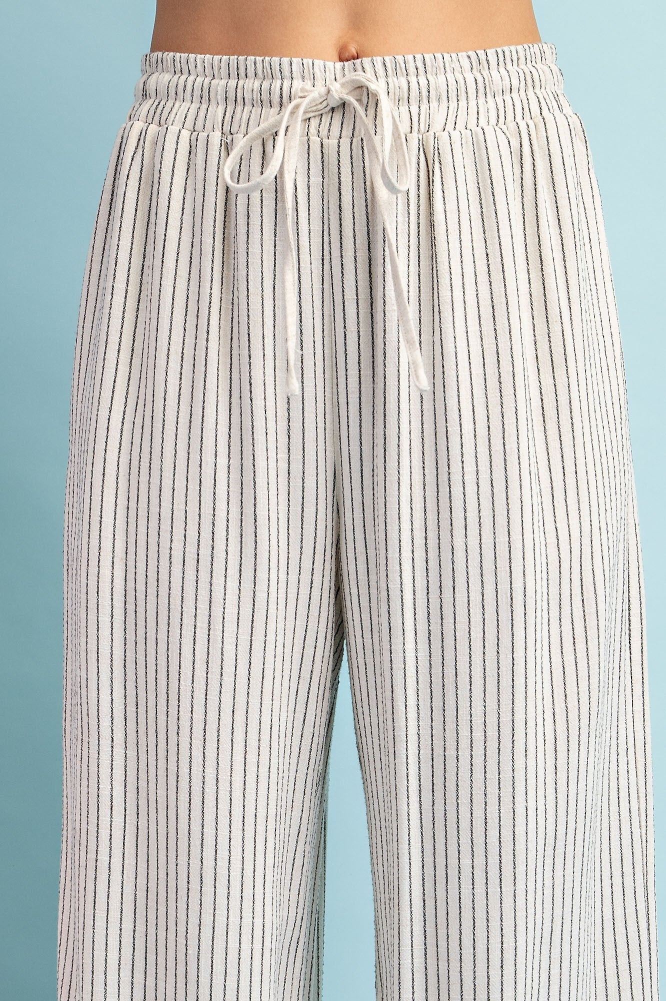 Pinstriped full length pants featuring an elastic and pull drawstring waistband, two side hip pockets and is a straight leg style.