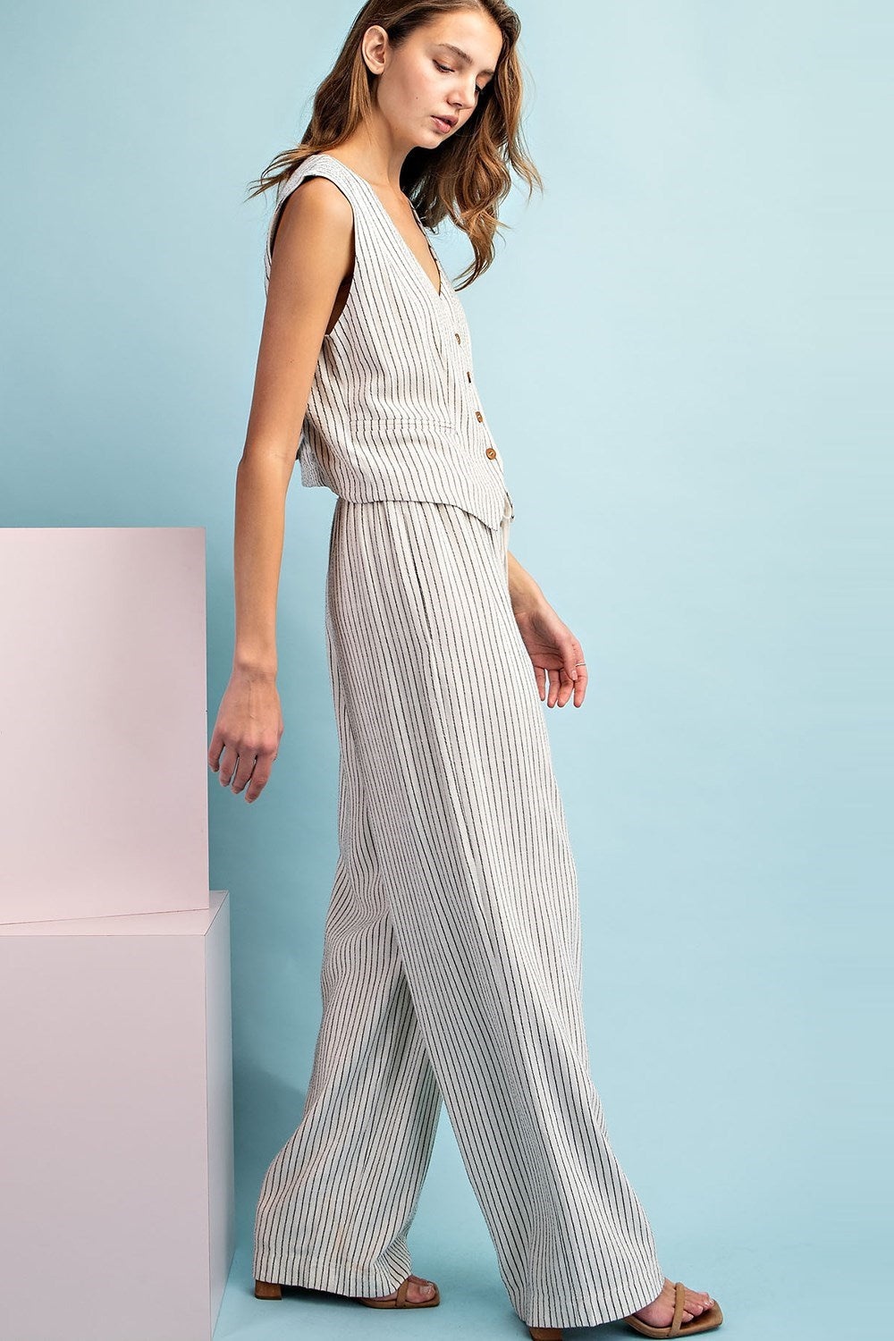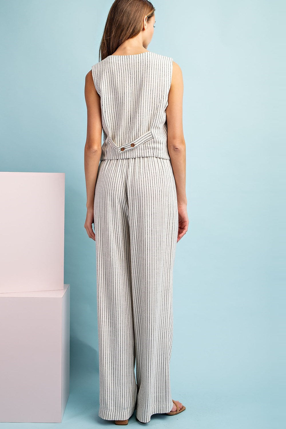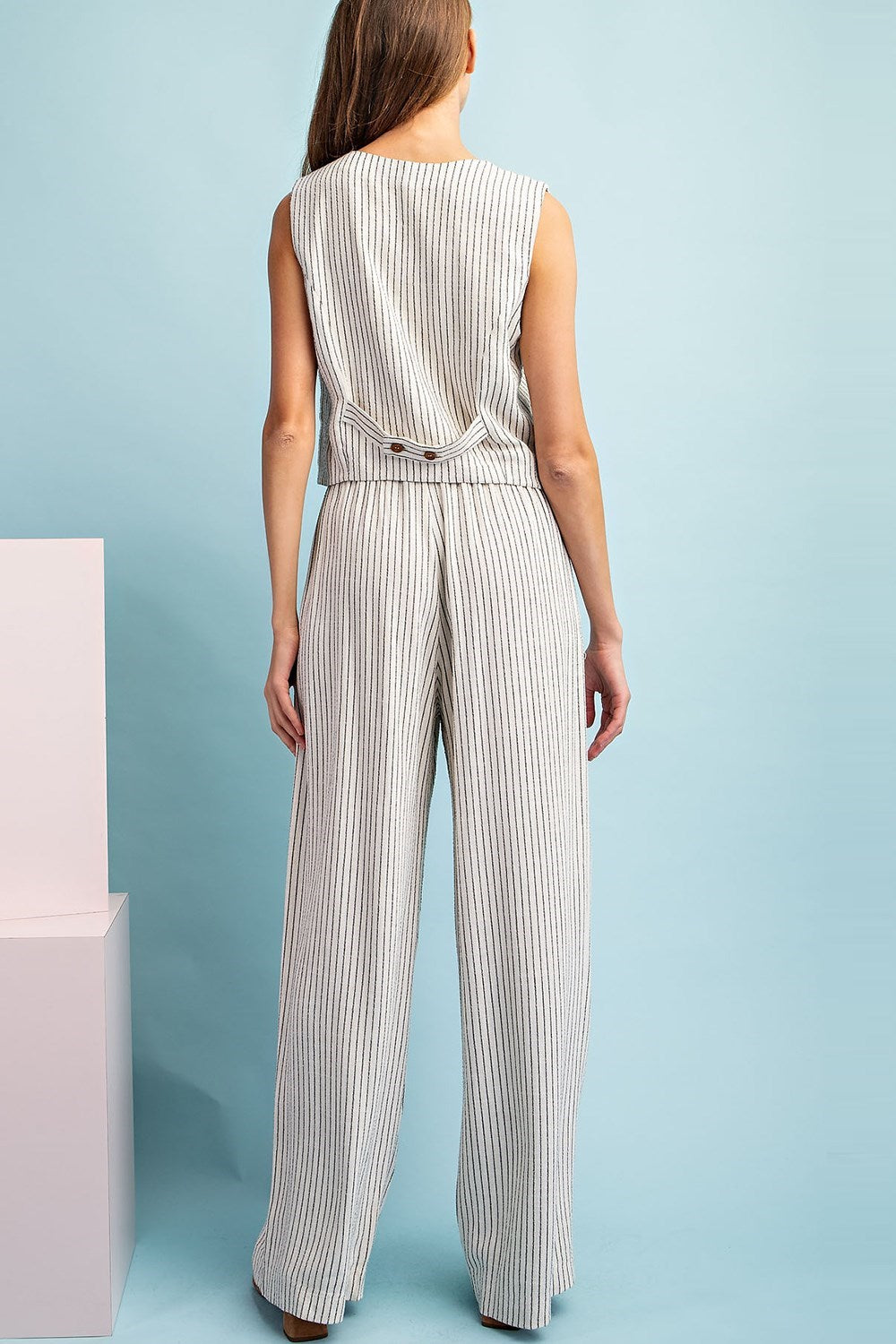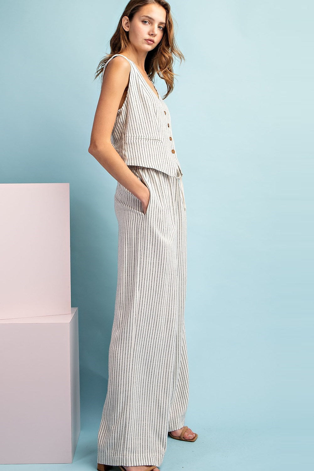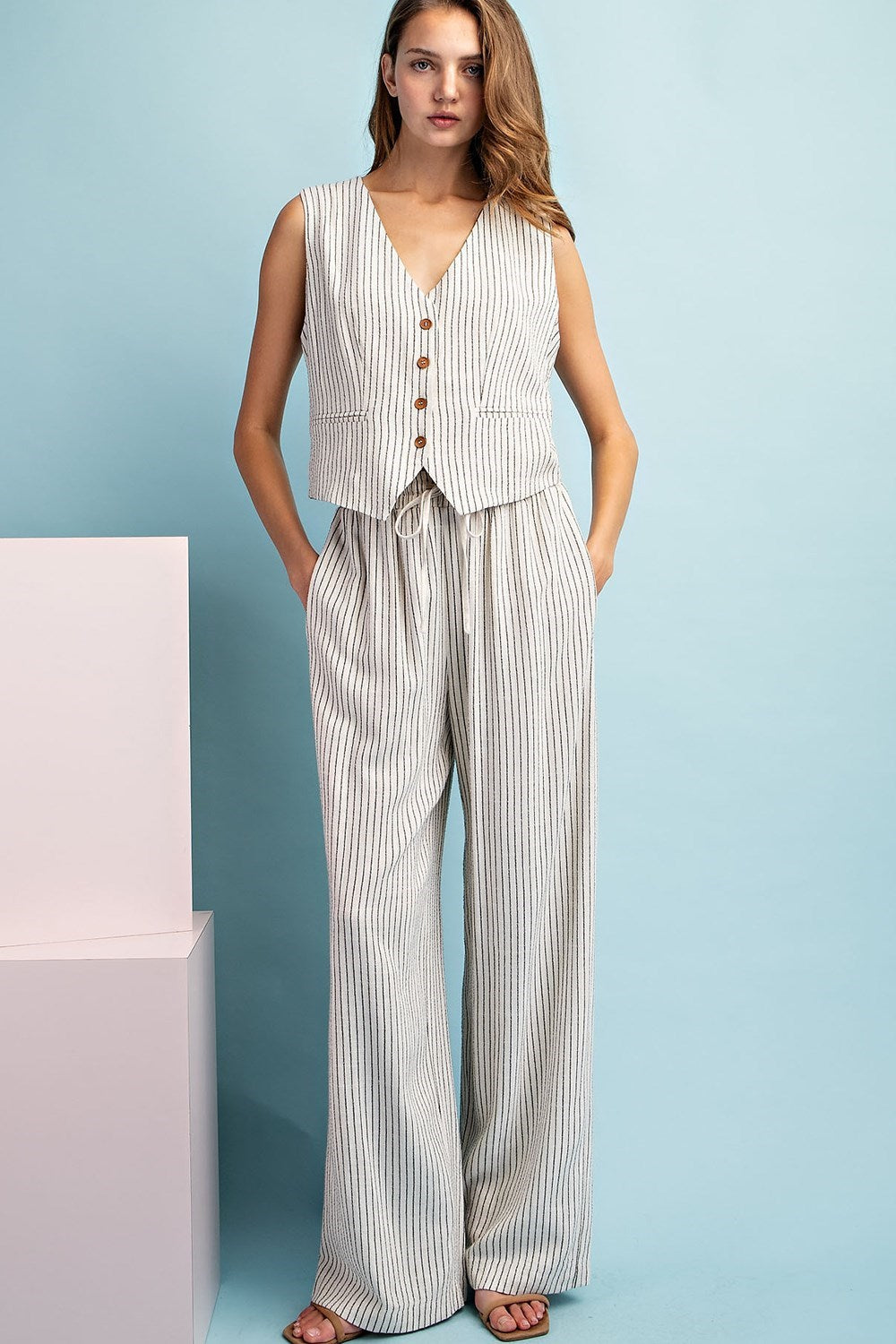 Pinstriped full length pants featuring an elastic and pull drawstring waistband, two side hip pockets and is a straight leg style.