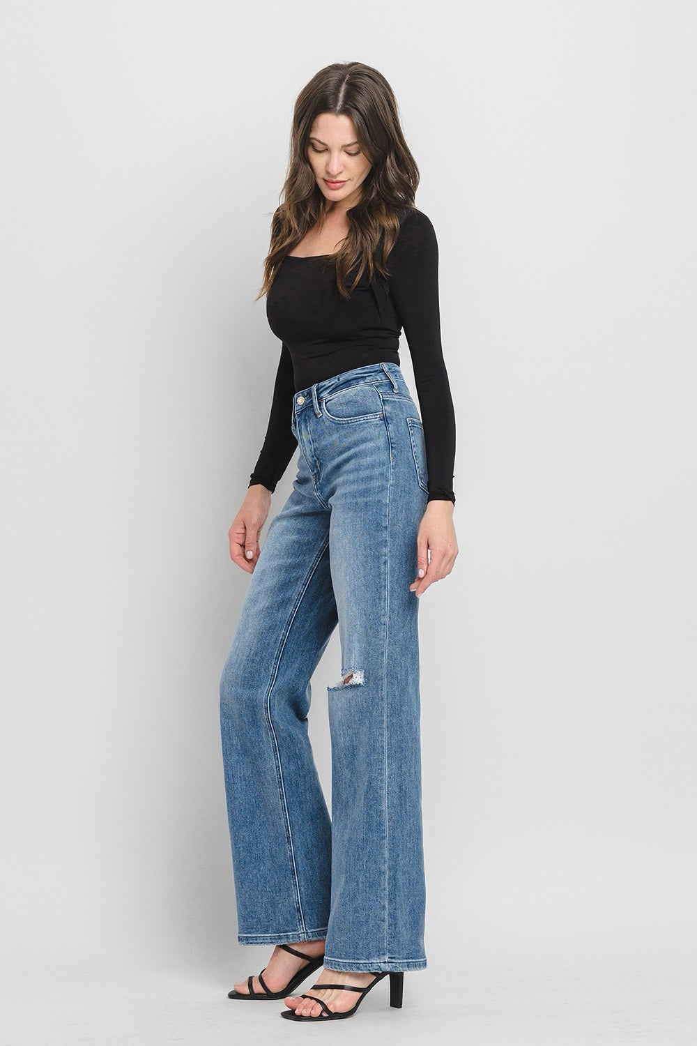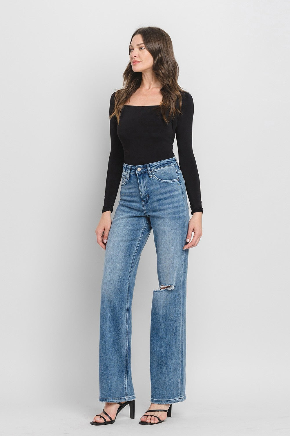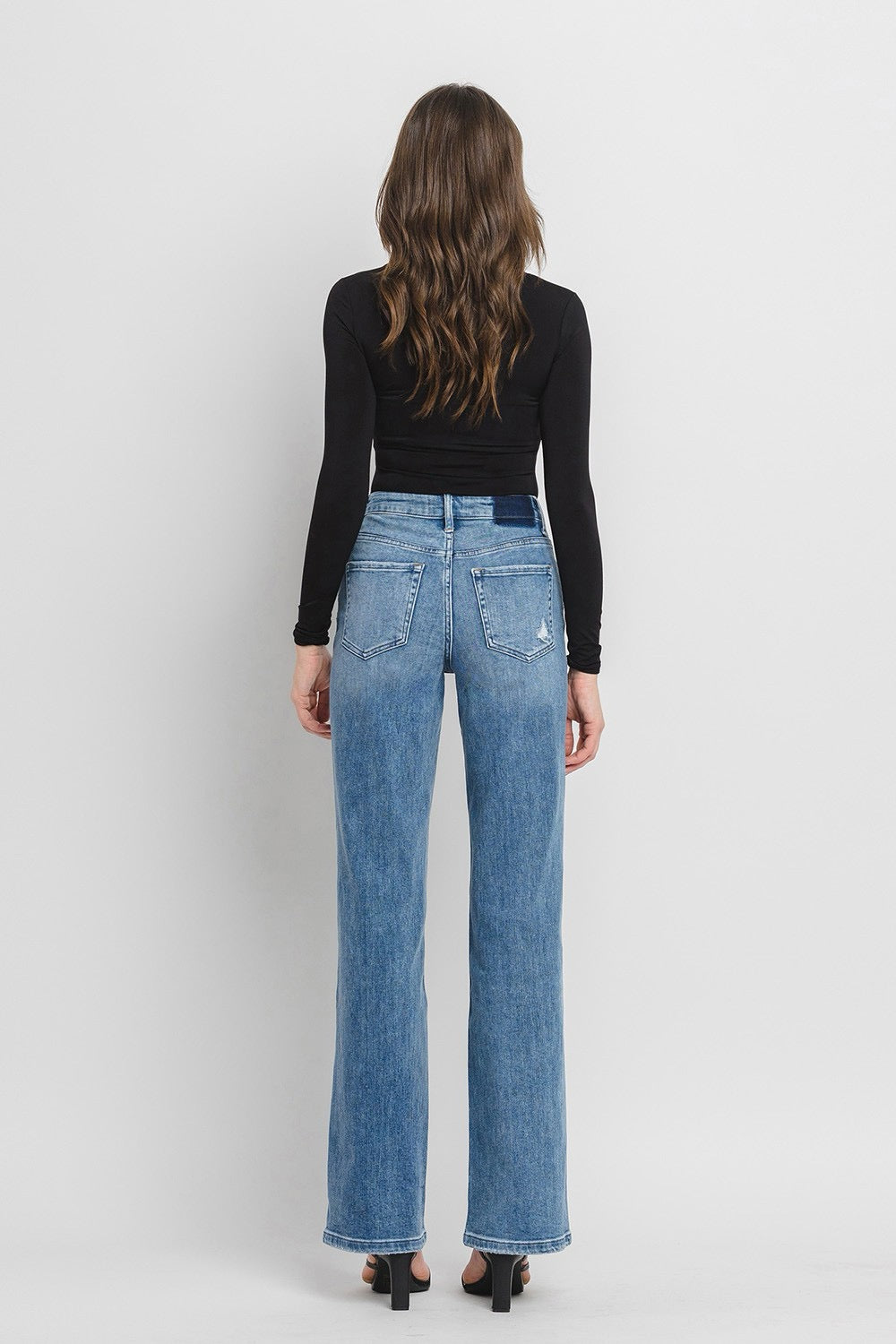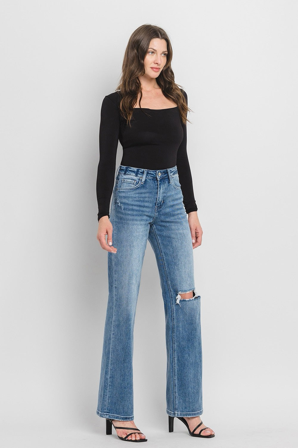 COMFORT STRETCH DENIM, SUPER HIGH RISE WAIST, 90'S VINTAGE STYLE, DISTRESSED DETAIL, FINISHED HEM, FULL LENGTH, FLARE JEANS