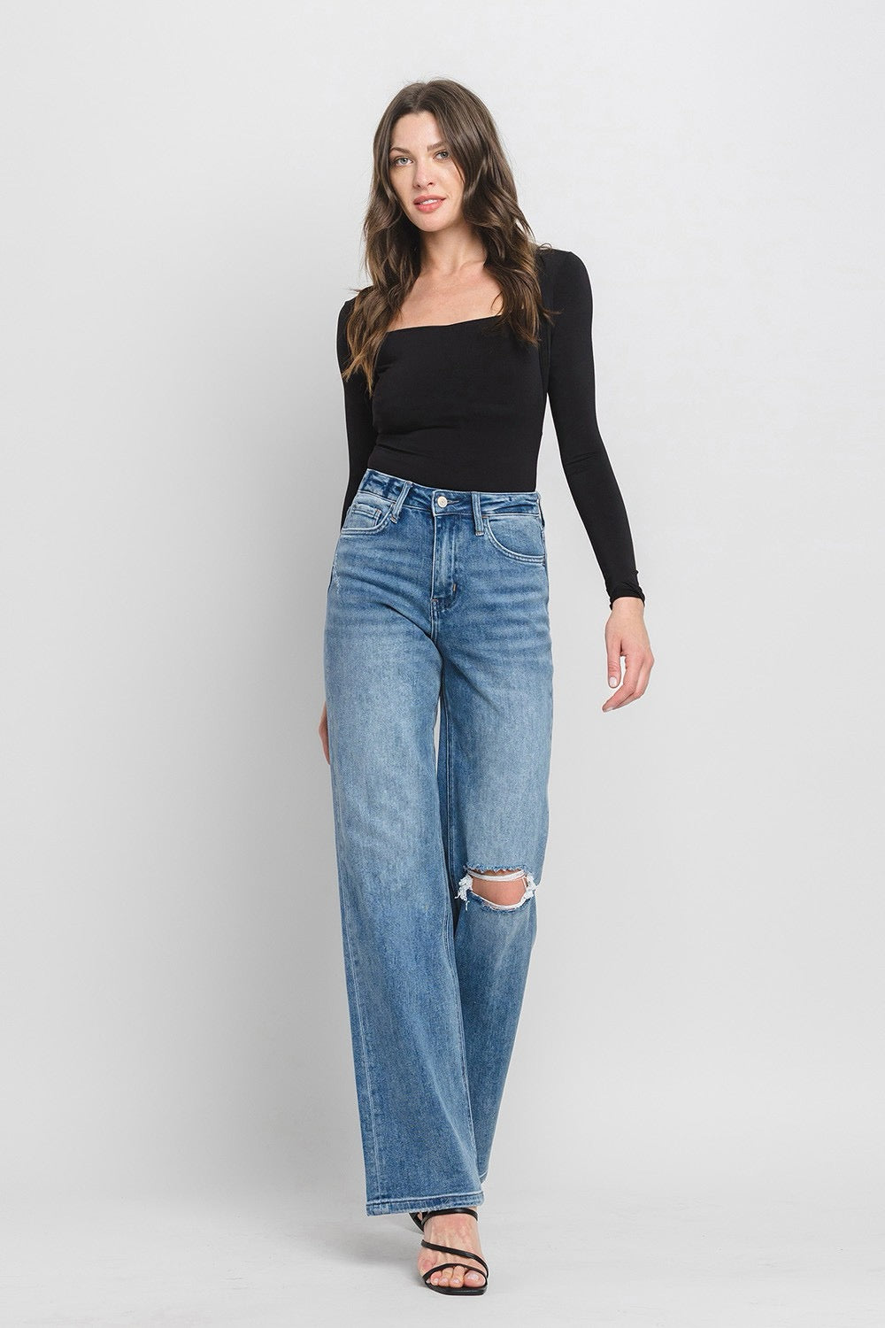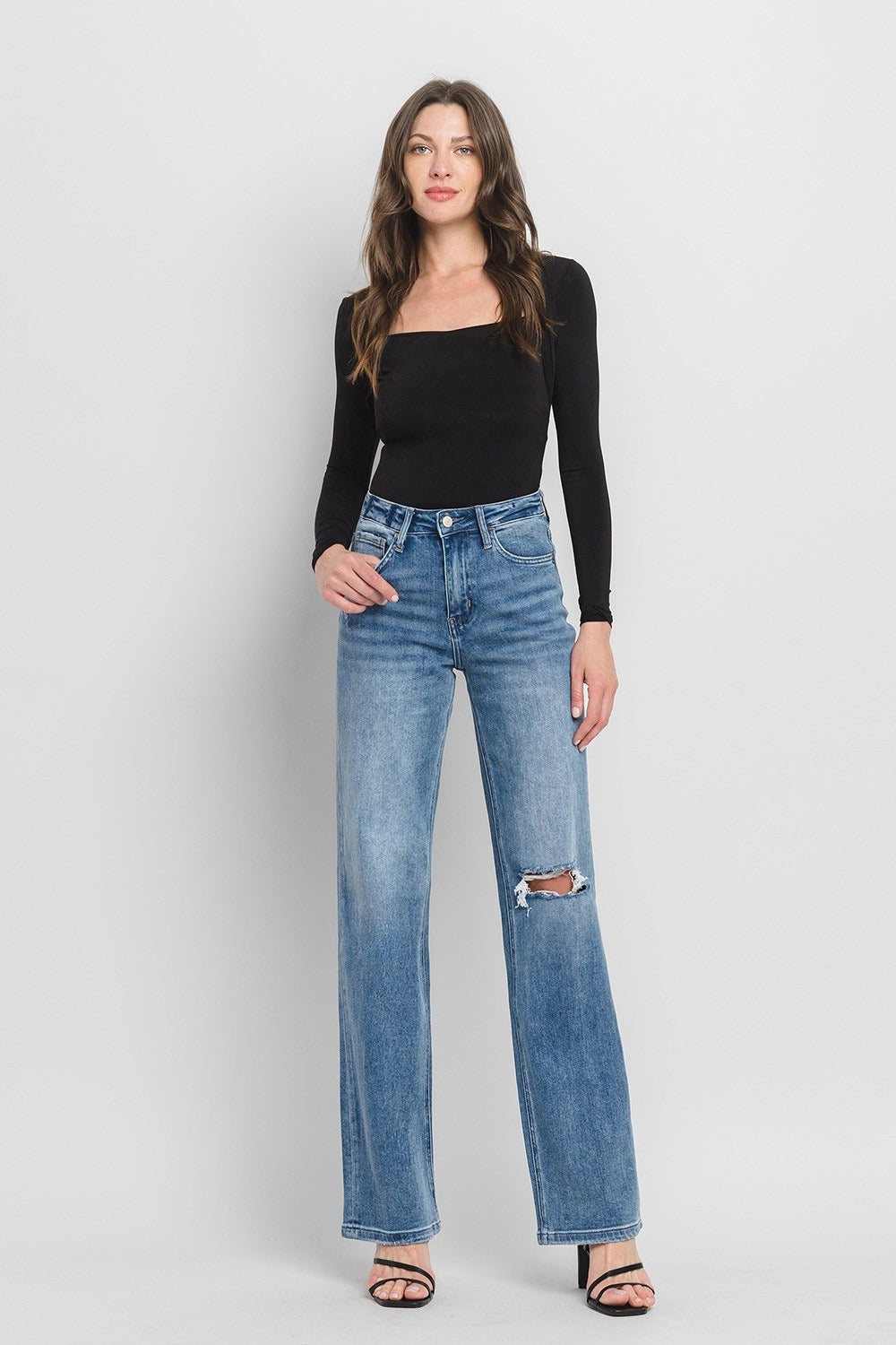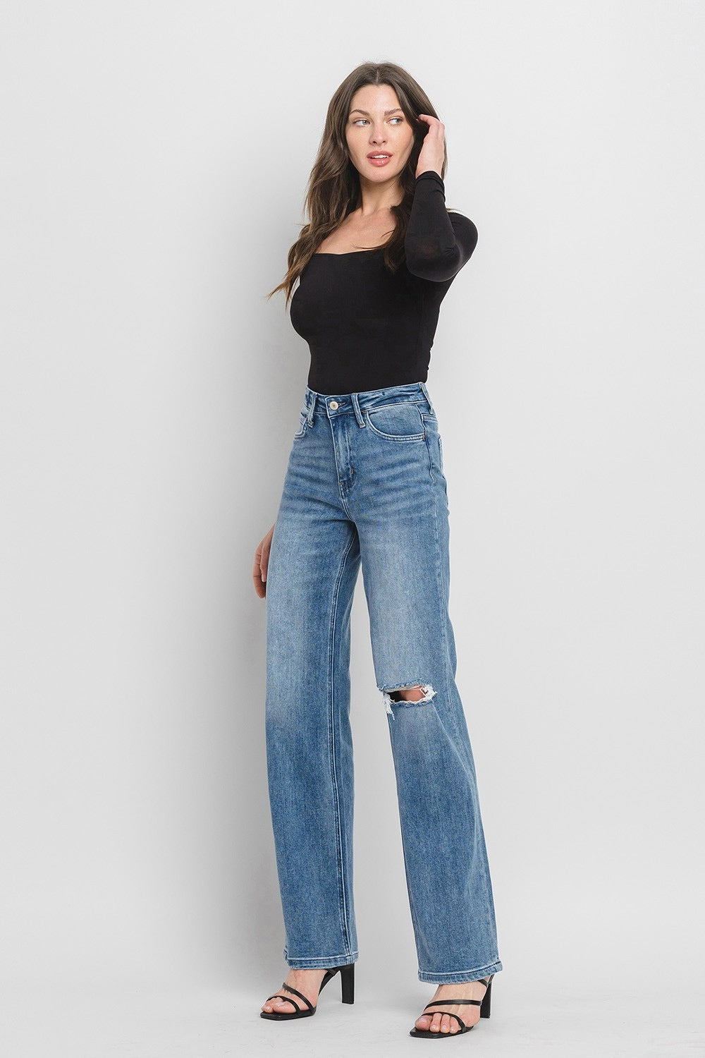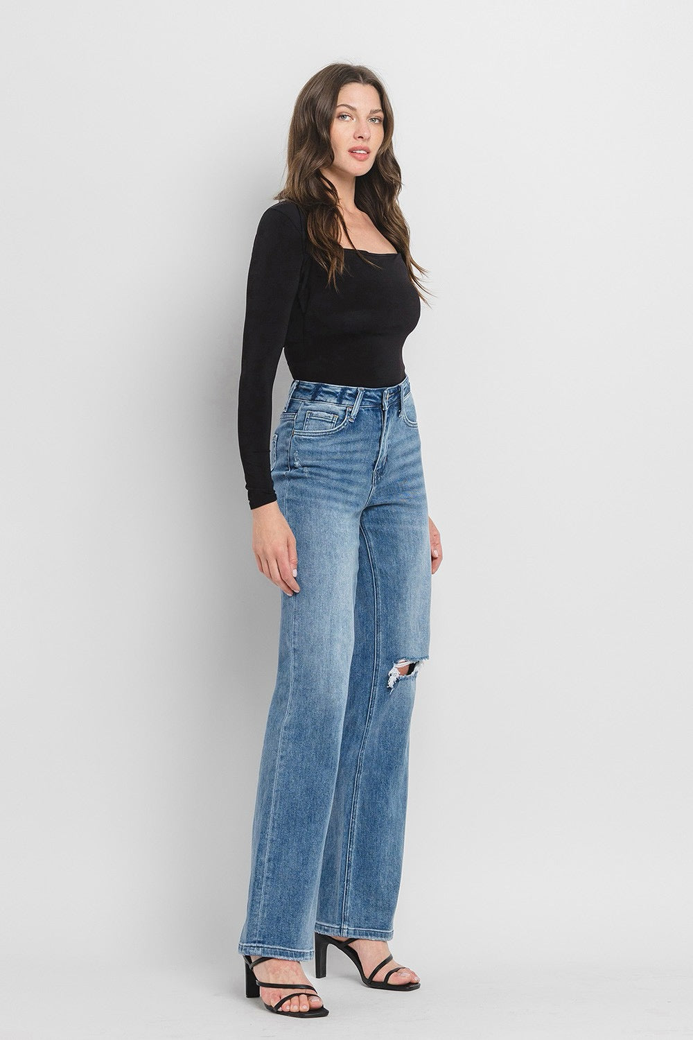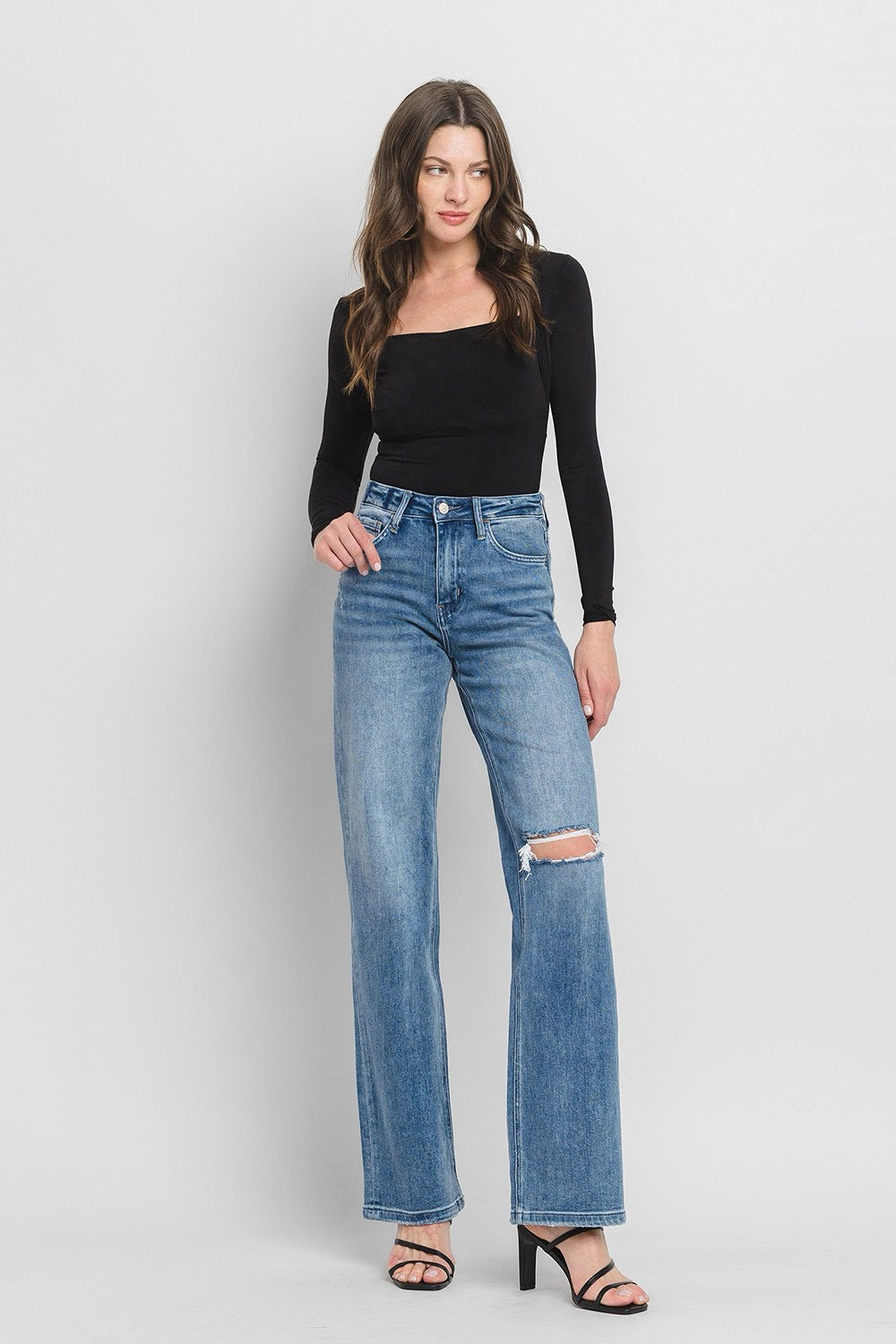 COMFORT STRETCH DENIM, SUPER HIGH RISE WAIST, 90'S VINTAGE STYLE, DISTRESSED DETAIL, FINISHED HEM, FULL LENGTH, FLARE JEANS