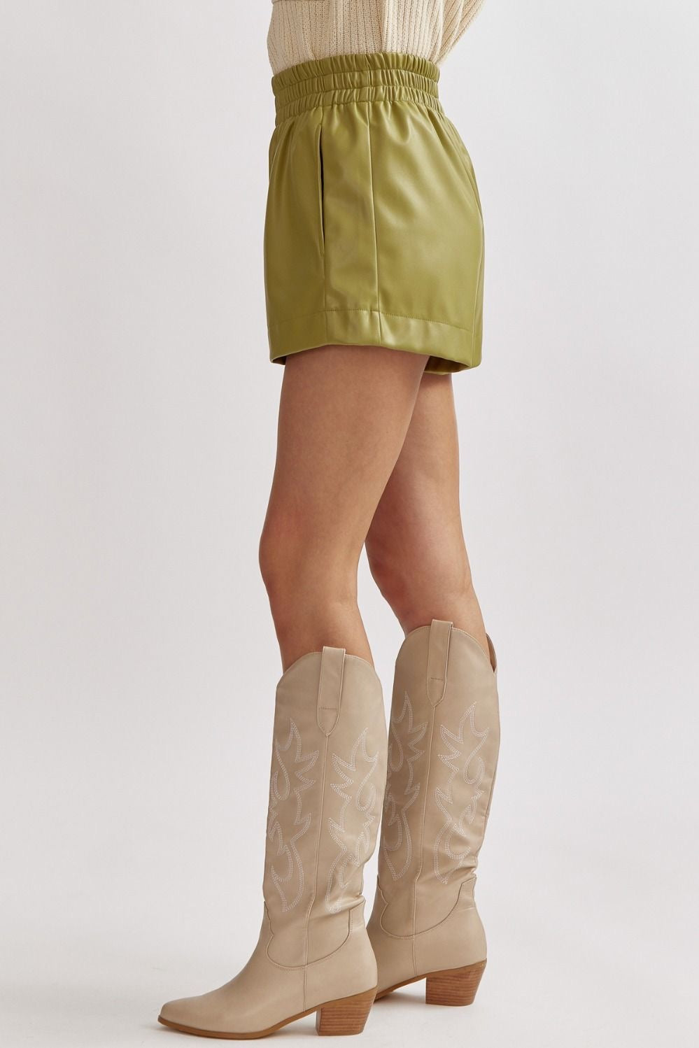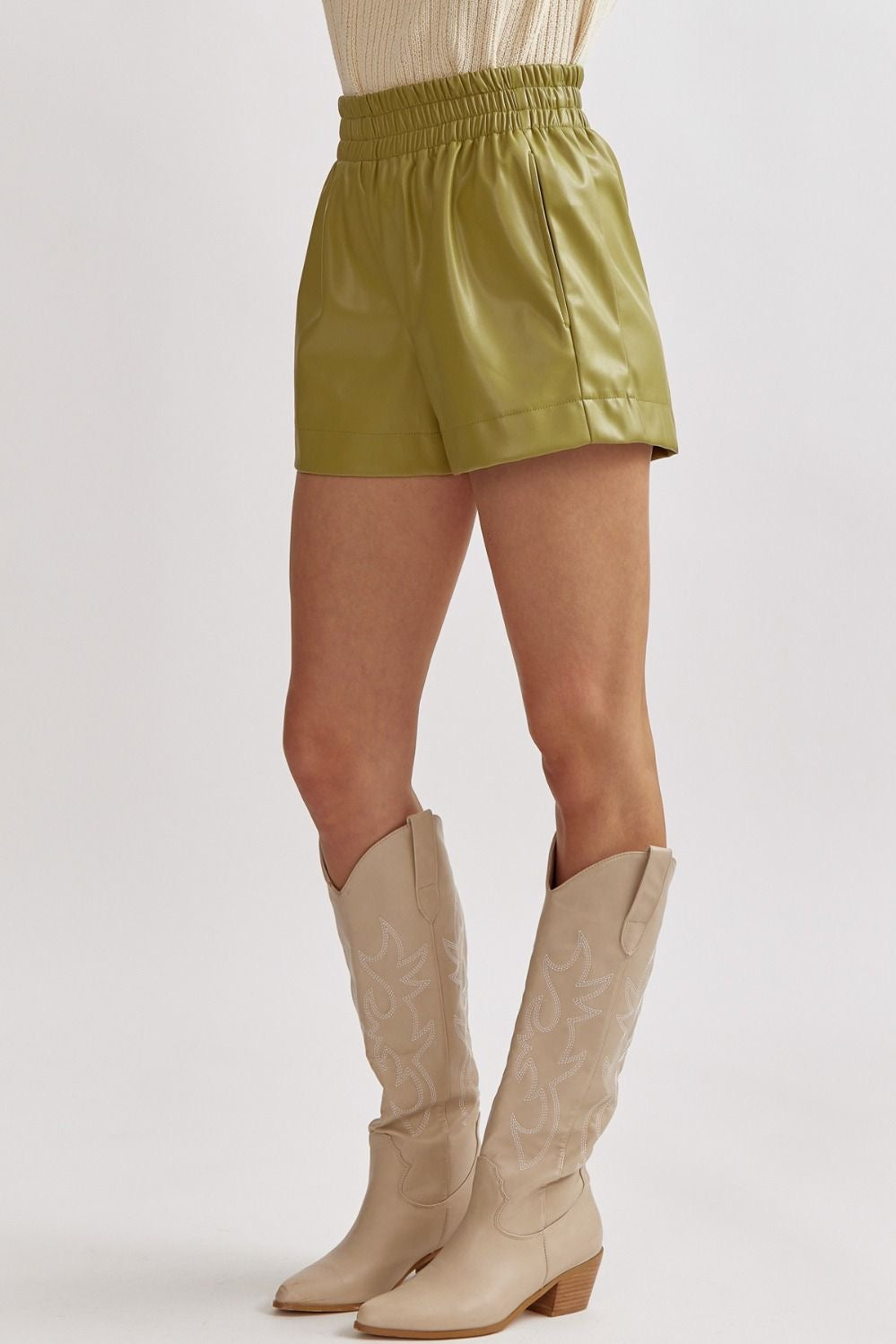 Faux leather high waisted shorts featuring elastic waistband. Pocket at sides. Unlined. Woven. Non-sheer. Lightweight.