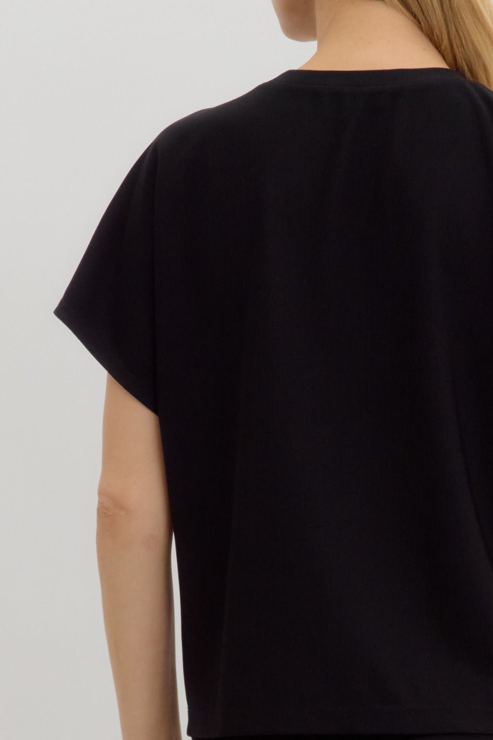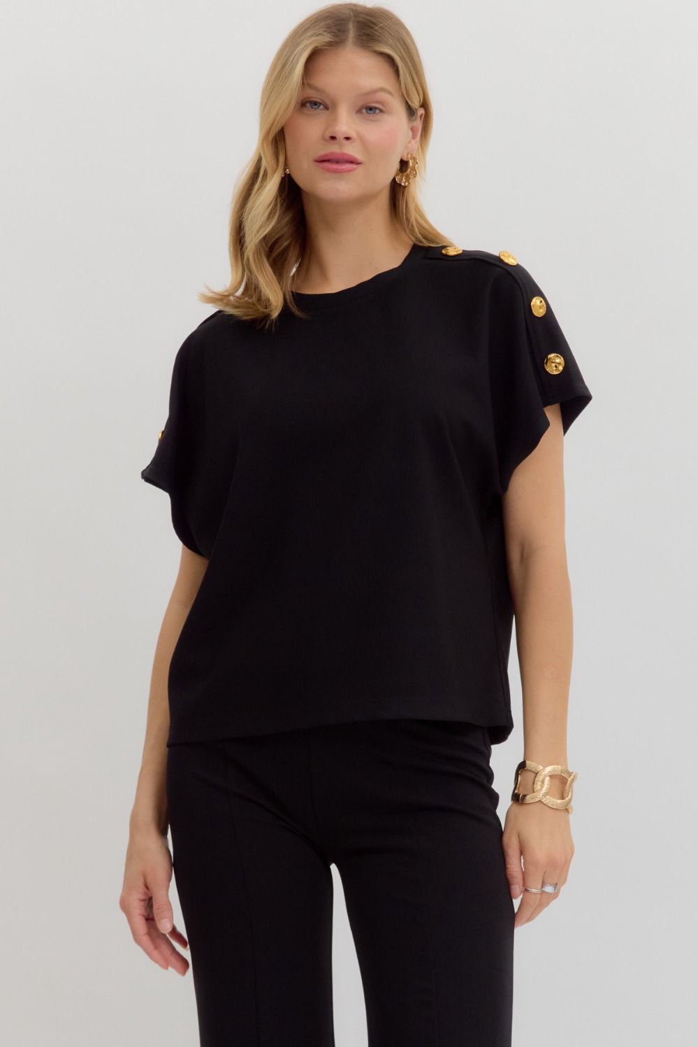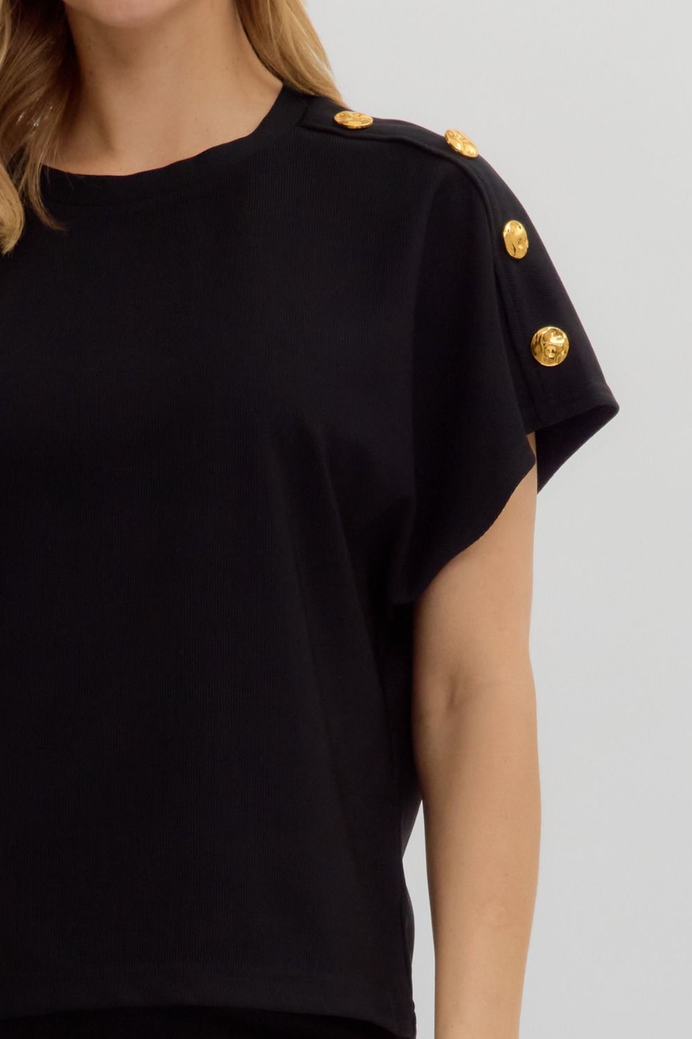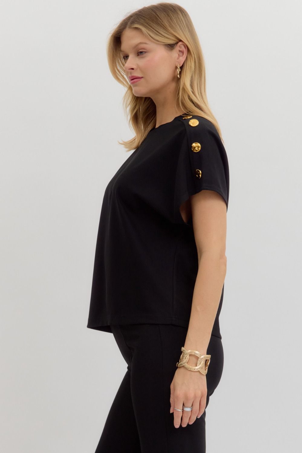 Solid crewneck short sleeve pullover top featuring gold accent button embellishment. Unlined. Knit. Non-sheer. Lightweight.