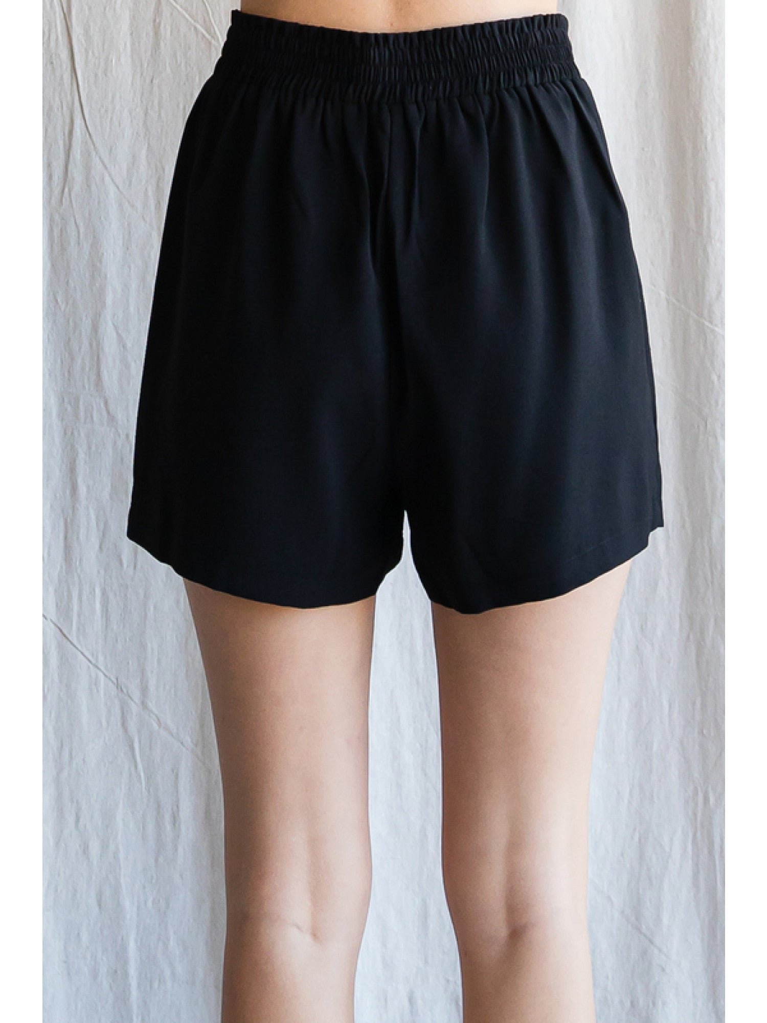 Solid shorts with a front tuck detail, smocked back waistline, and side pockets.