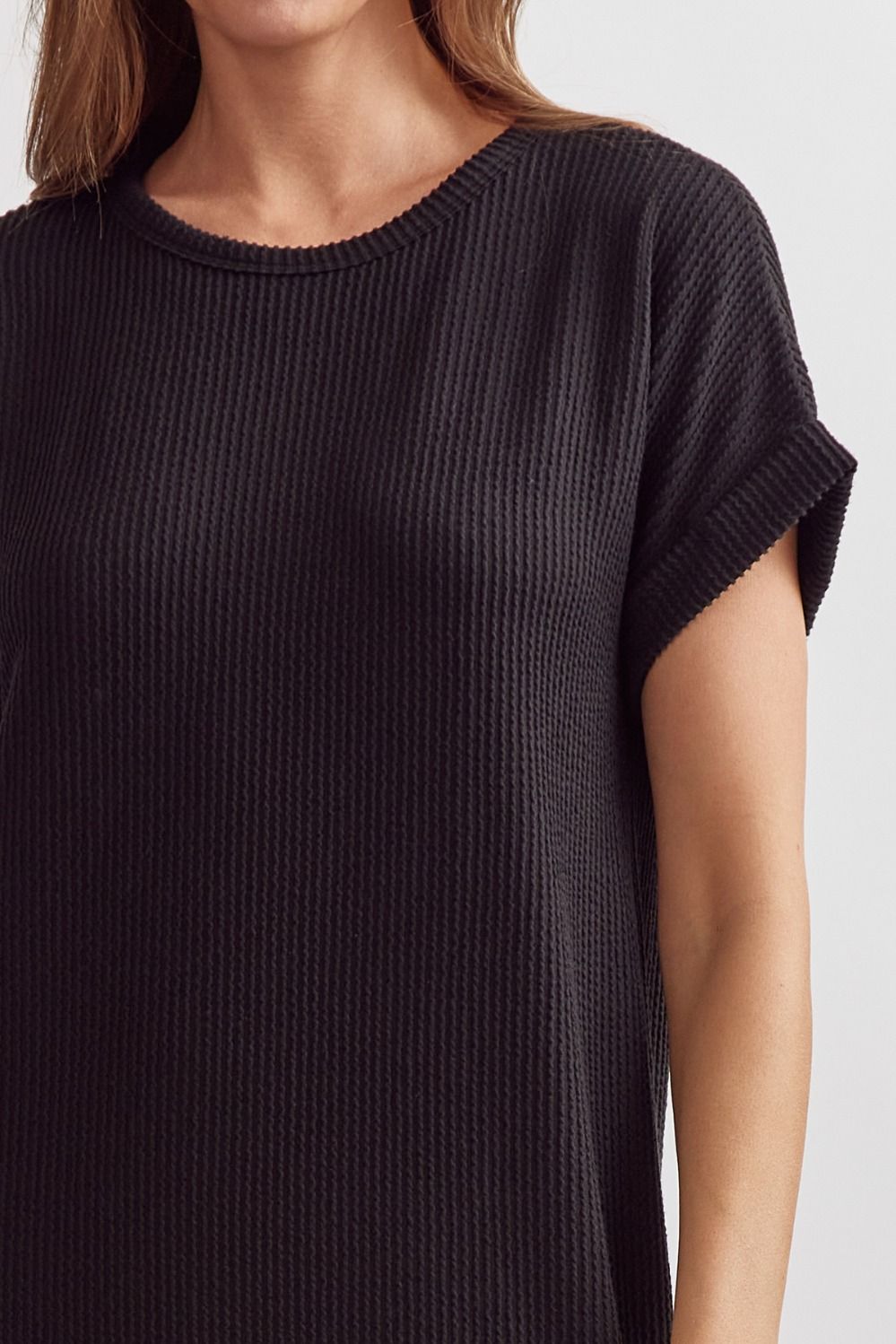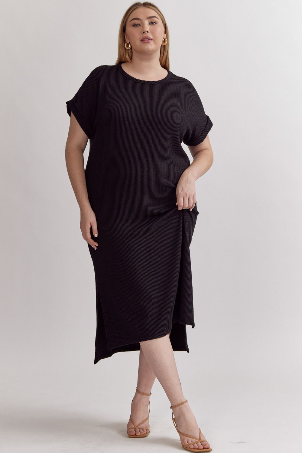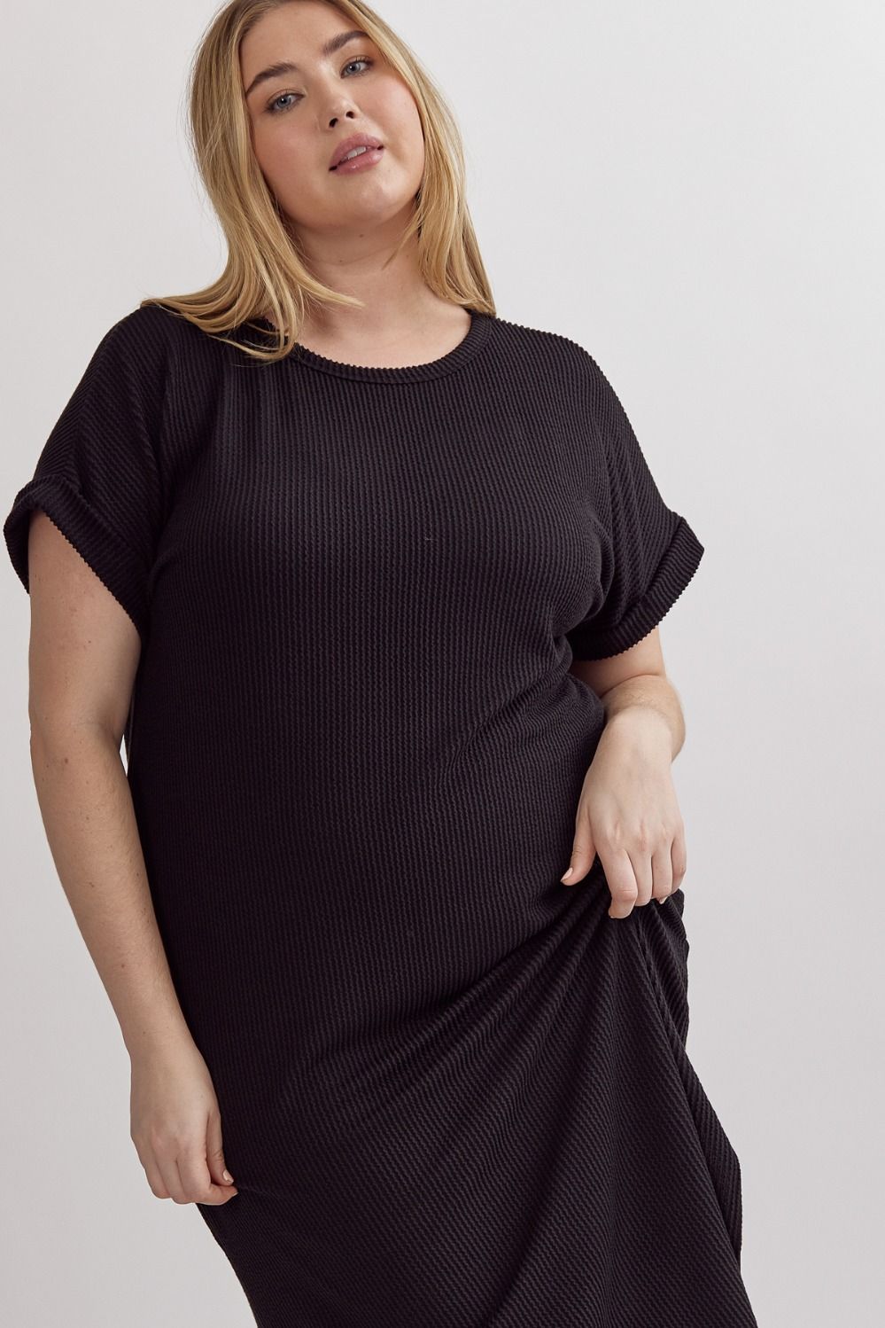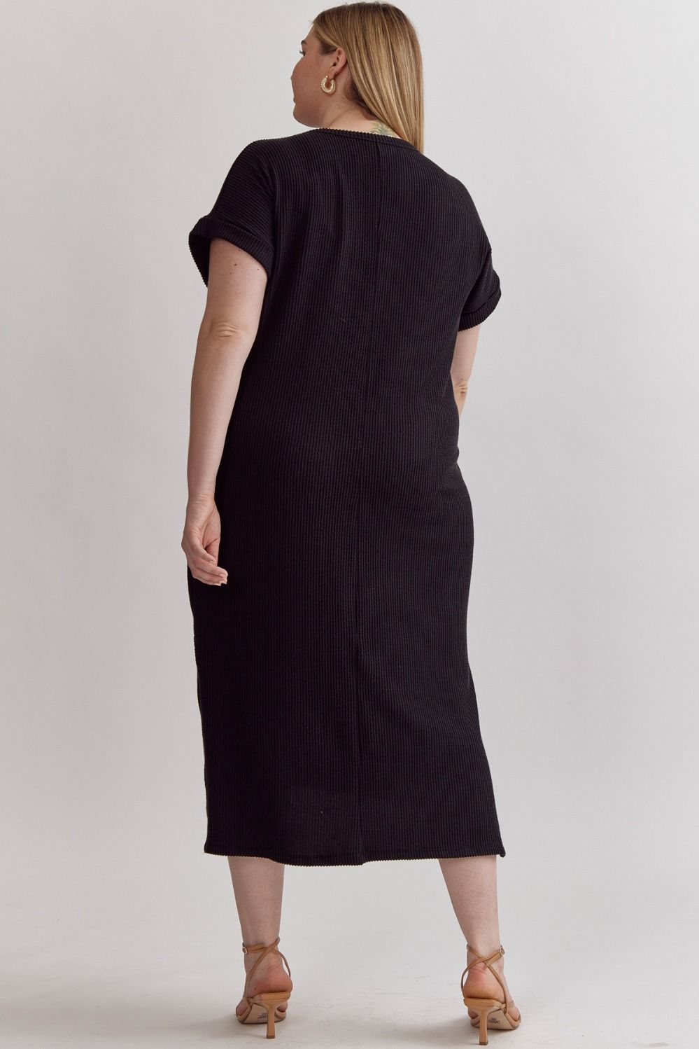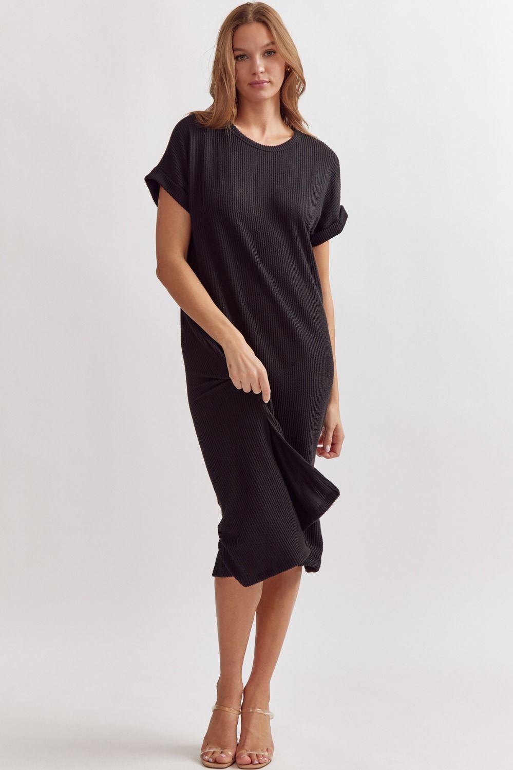 Black Ribbed Short Sleeve Midi Dress