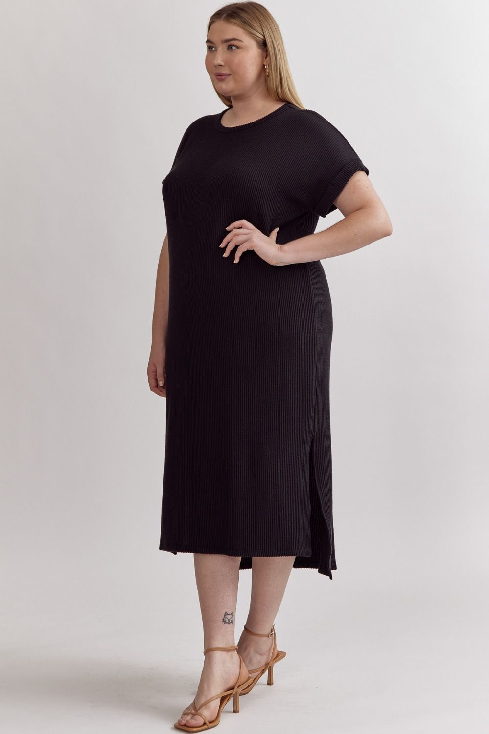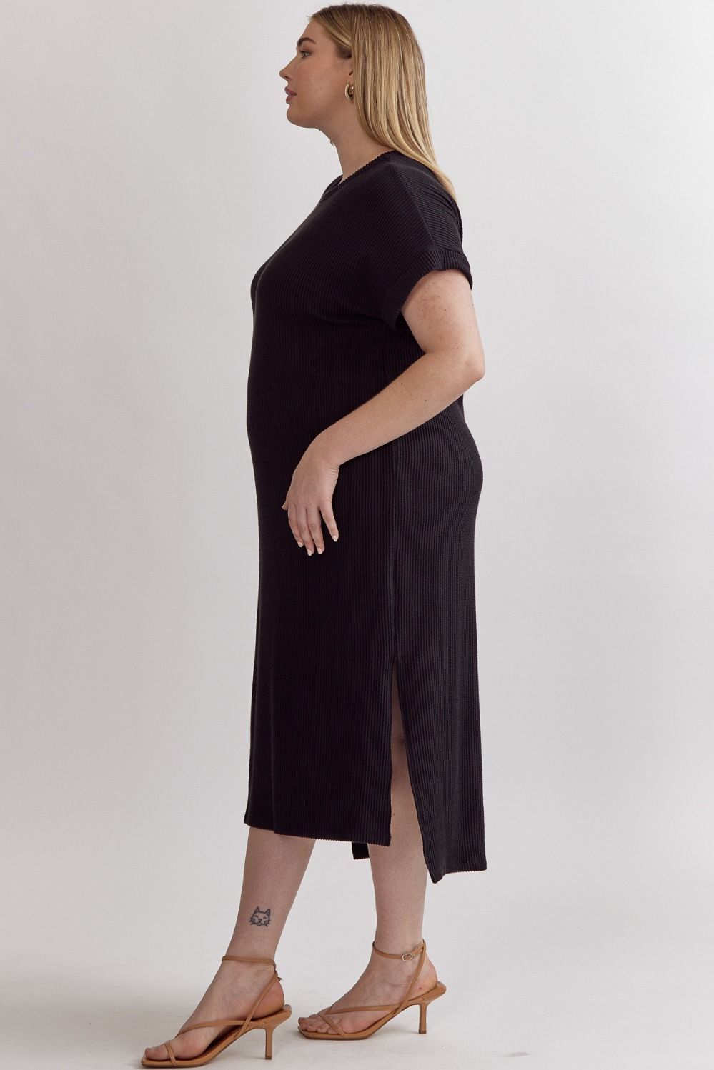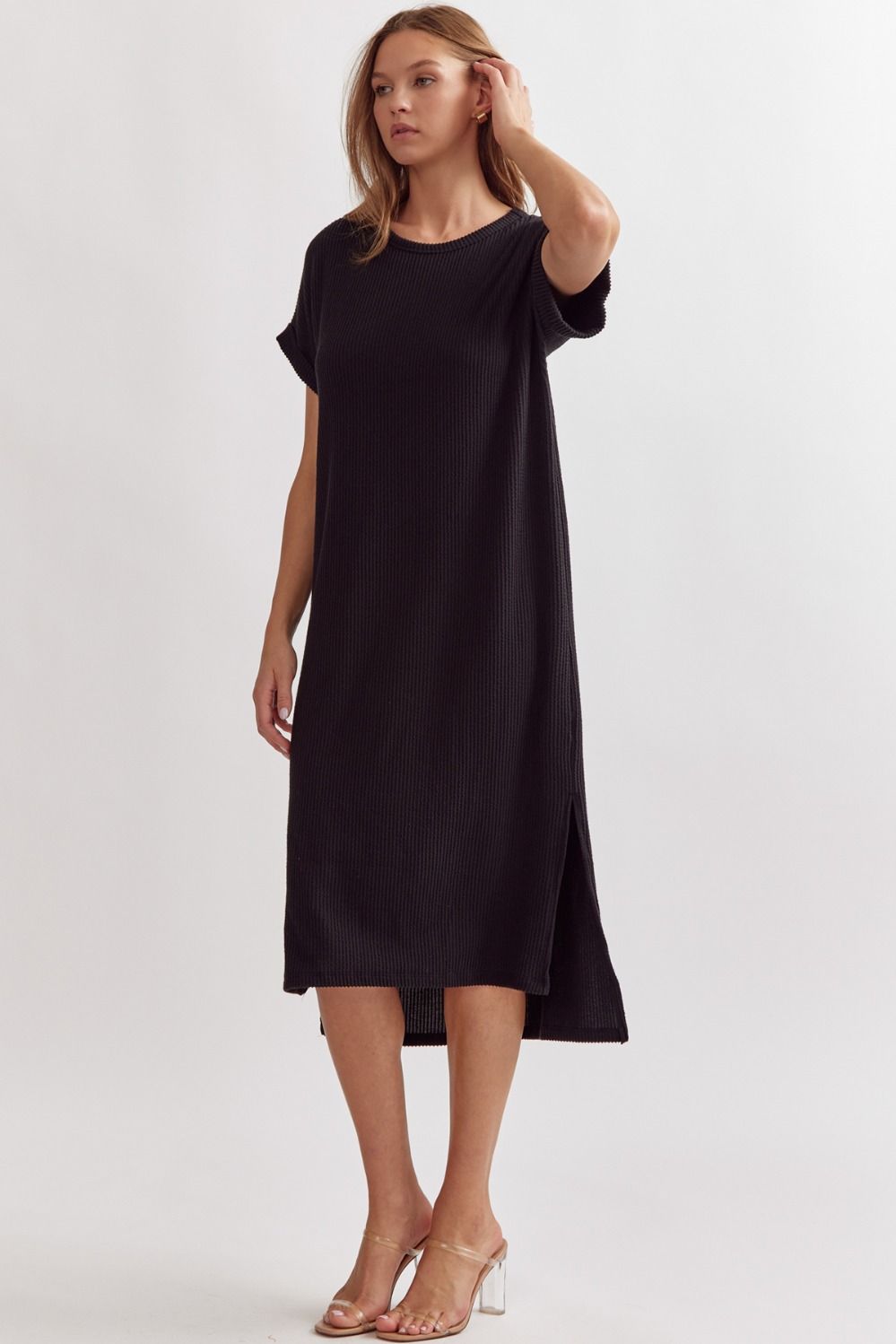 Ribbed short sleeve midi dress featuring slit at side hem. Unlined. Knit. Non-sheer. Lightweight.