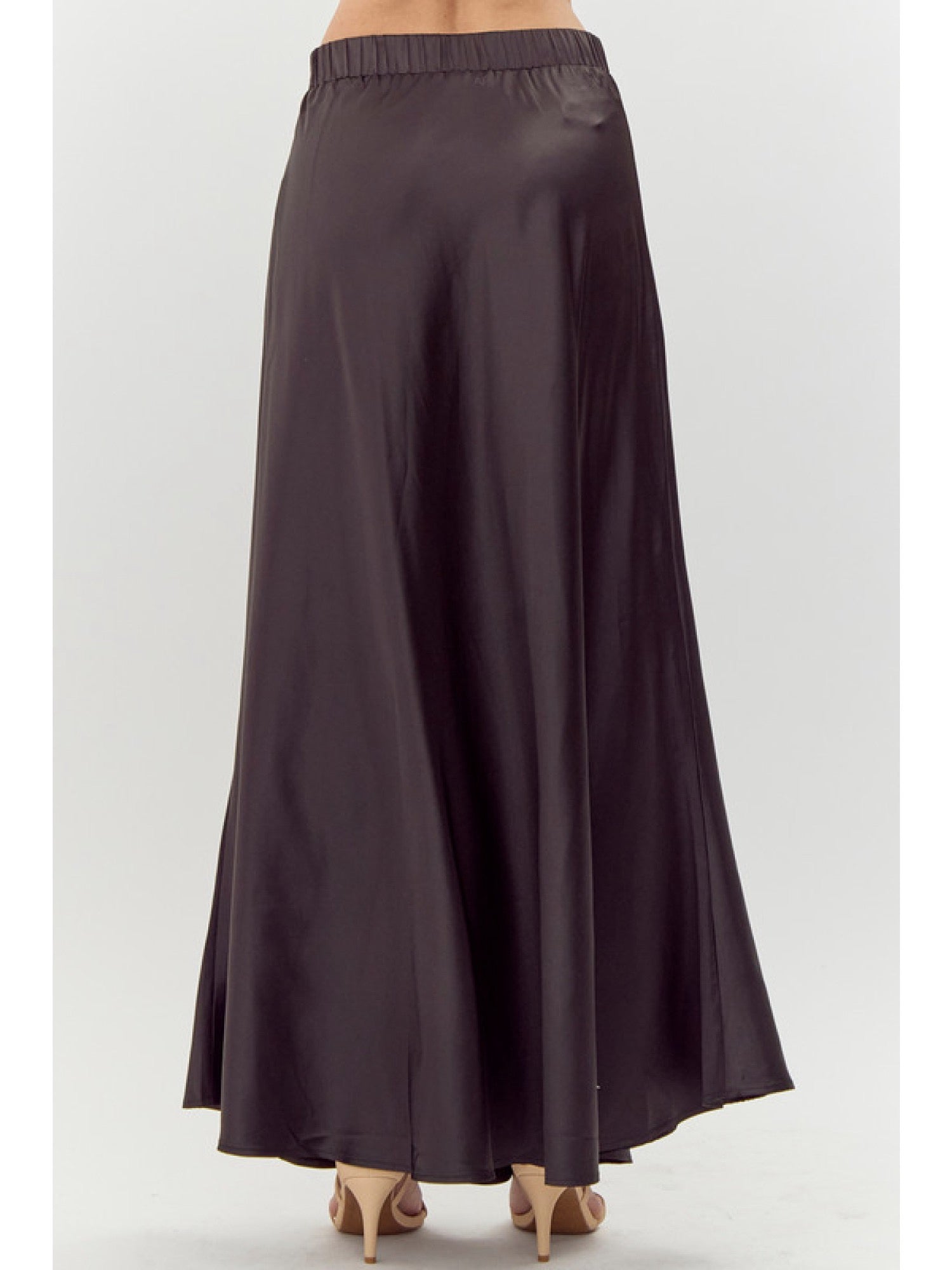 The elastic waistband ensures a comfortable, secure fit, allowing for ease of movement while maintaining a chic, streamlined appearance. Pair this skirt with a blouse for a sophisticated office ensemble or dress it down with a casual top for a more relaxed, stylish look. Whether you're attending a special event or simply want to elevate your everyday wardrobe, this black satin midi skirt is a must-have staple that exudes timeless elegance.