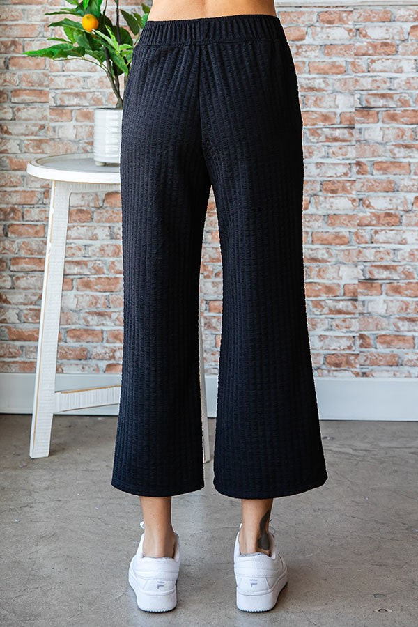 SOLID COLOR TEXTURED PALAZZO PANTS FEATURING ELASTIC BANDED WAISTLINE AND TWO SIDE POCKETS.