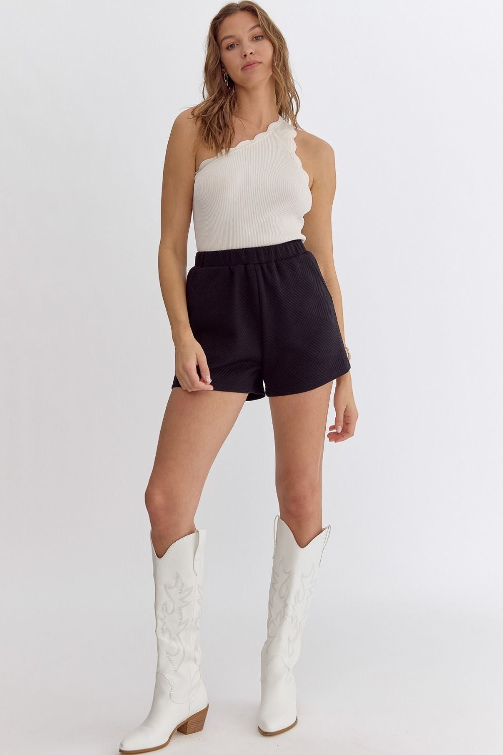 Textured high-waisted shorts featuring elastic waistband. Pockets at side. Unlined. Knit. Non-sheer. Lightweight.