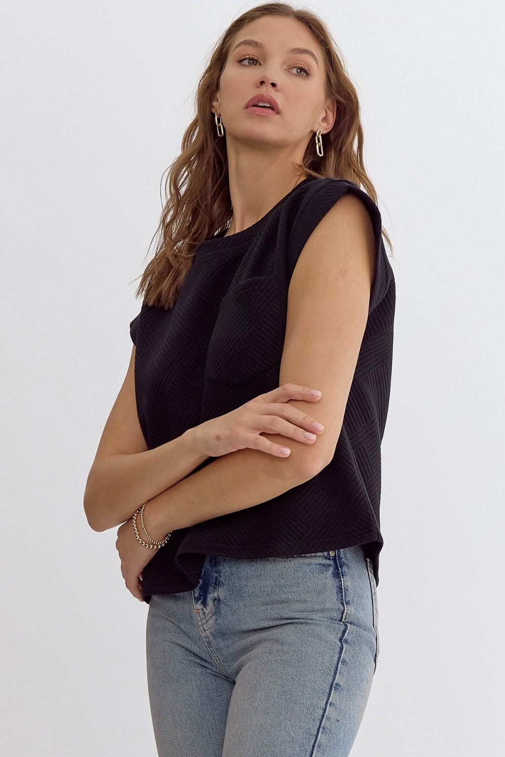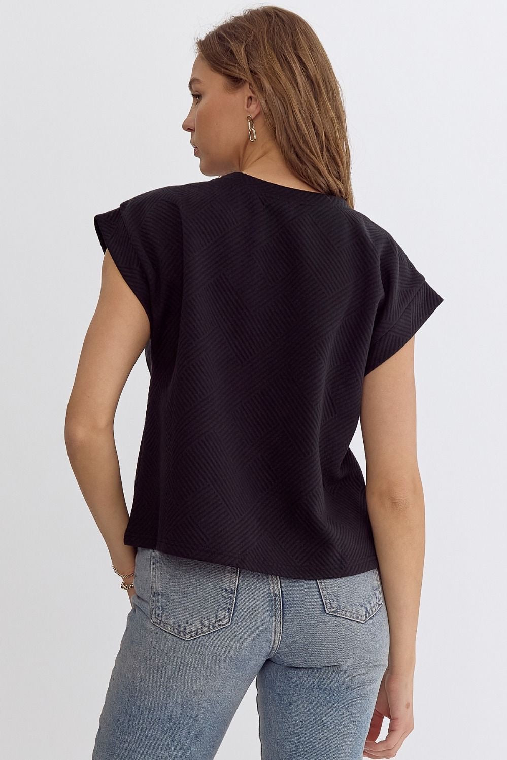 Textured round neck short sleeve cropped top featuring single pocket at bust. Unlined. Knit. Non-sheer. Lightweight.