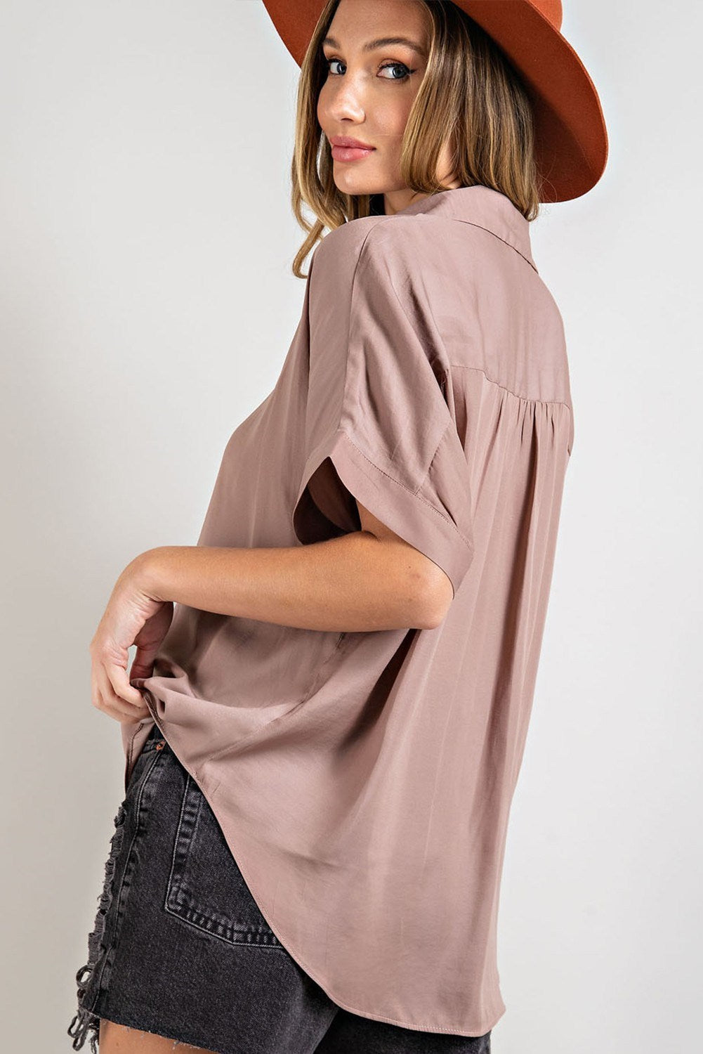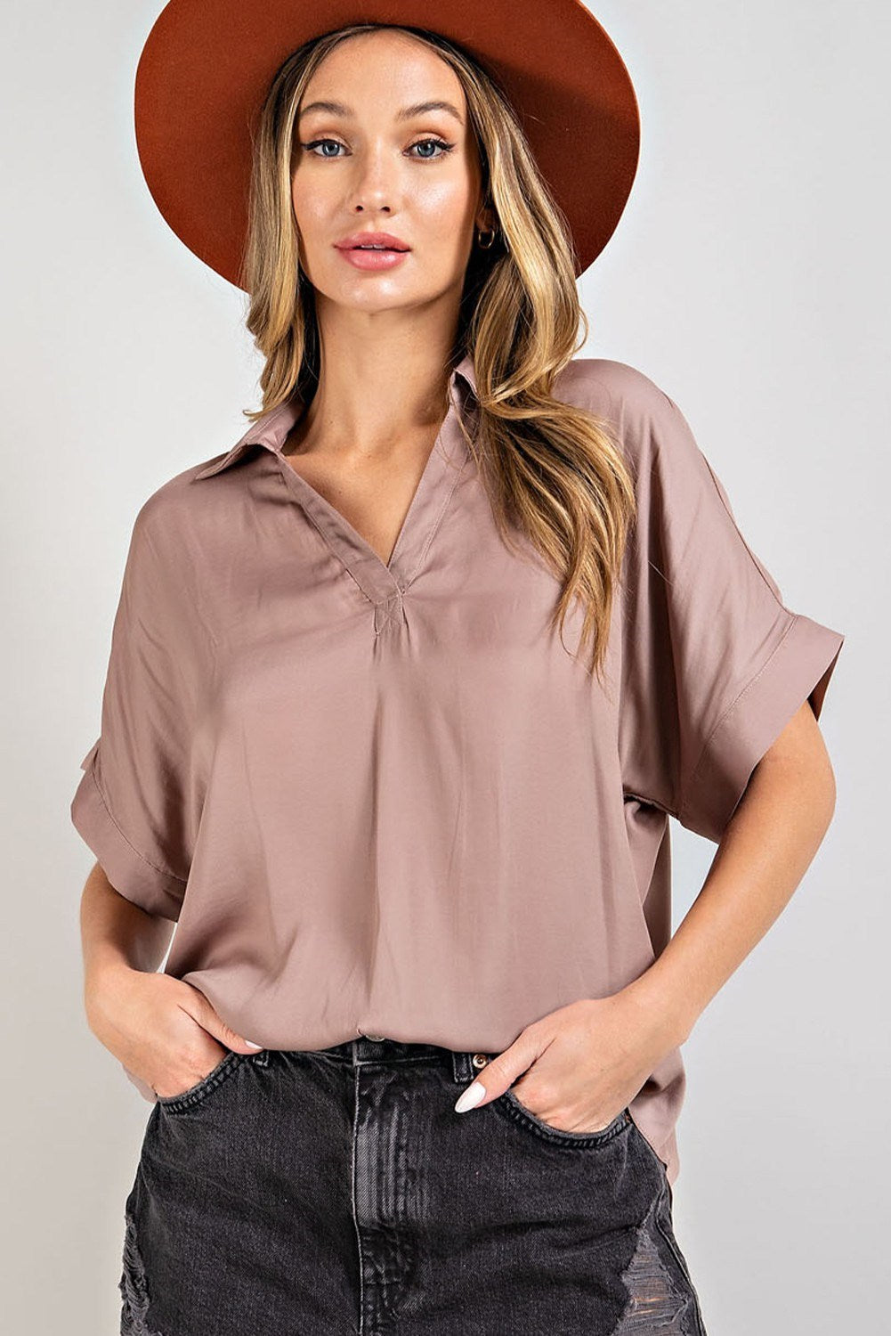 Short sleeve blouse top made in a light weight, airy fabric with a collared + v-neckline.