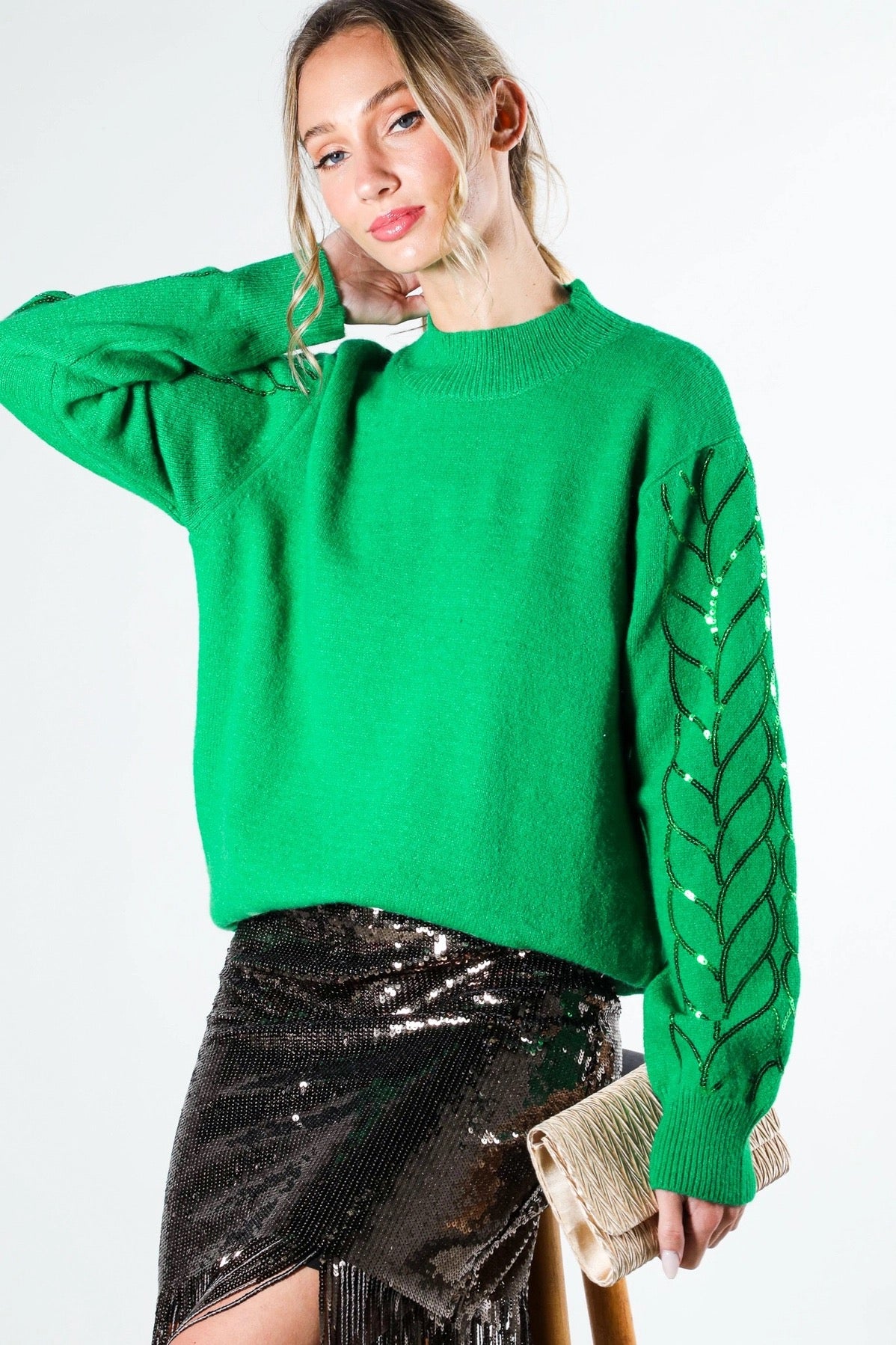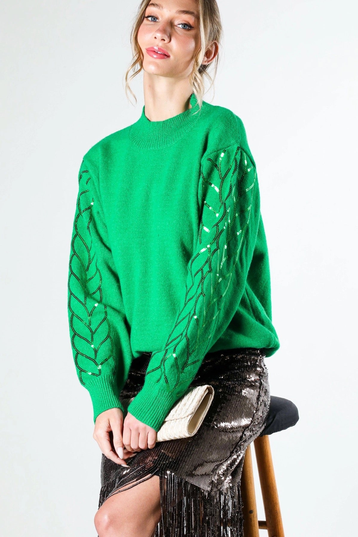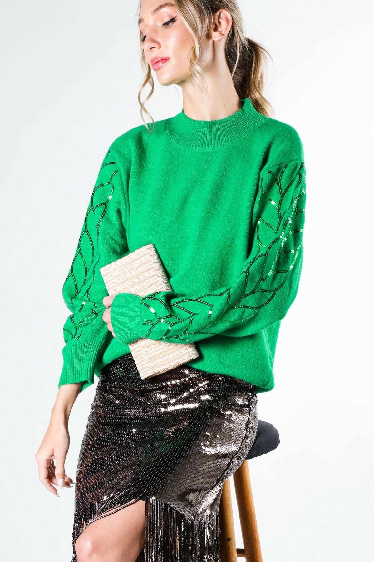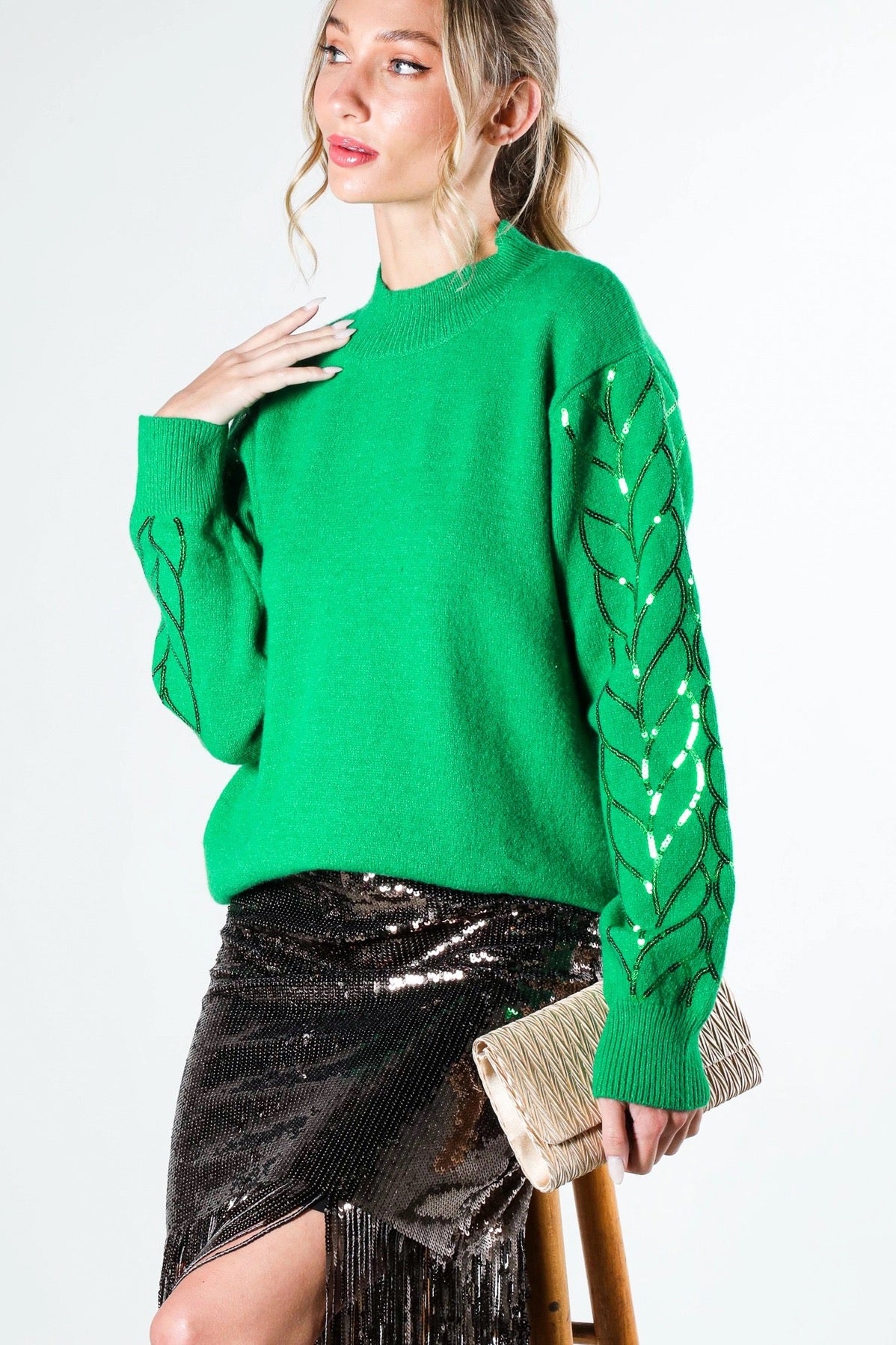 This eye-catching green sweater is a perfect blend of comfort and style for your wardrobe. Made from a soft, breathable fabric, it features an intricate embroidered sequin design along the arms, adding an artistic touch to the piece. The rich green color brings a fresh and vibrant look, ideal for brightening up any outfit. With its relaxed fit, this sweater offers both comfort and fashion versatility. It's an excellent choice for layering during cooler months or as a statement piece for casual outings. Pair it with your favorite jeans for a laid-back style or dress it up with tailored pants for a more polished appearance.