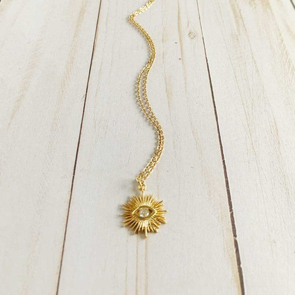 Features a bright CZ stone in the center and spikes or rays of sun coming out around it. Adjustable chain. Gold plated.