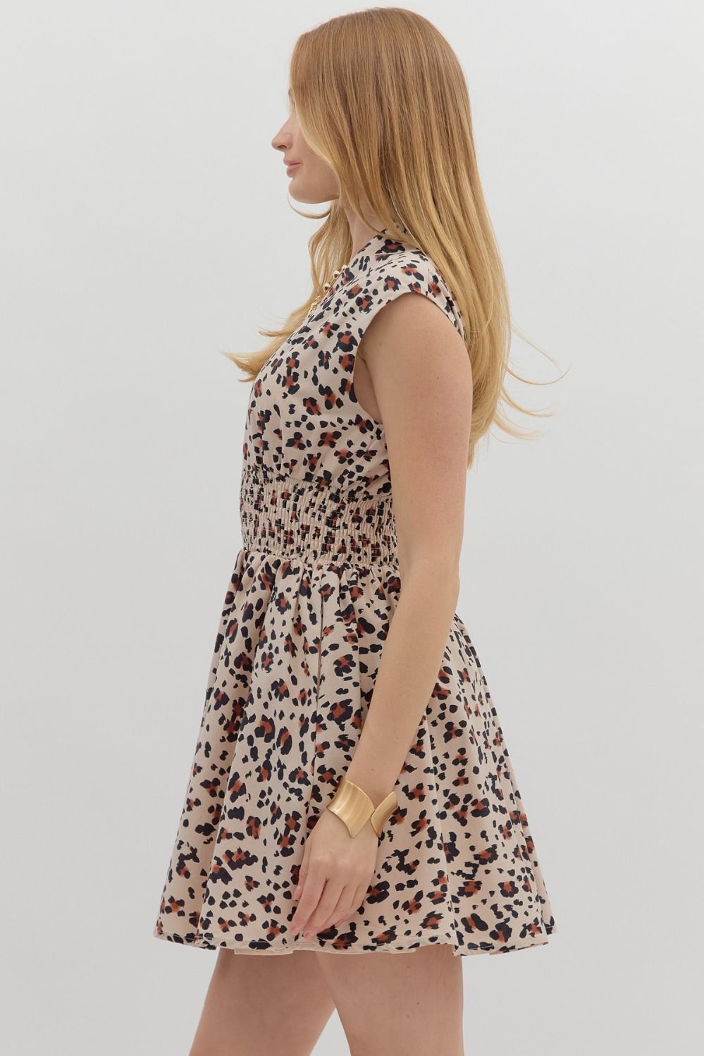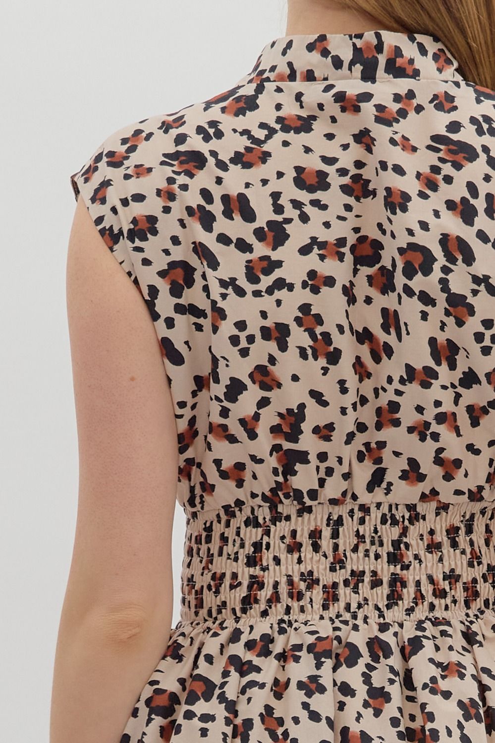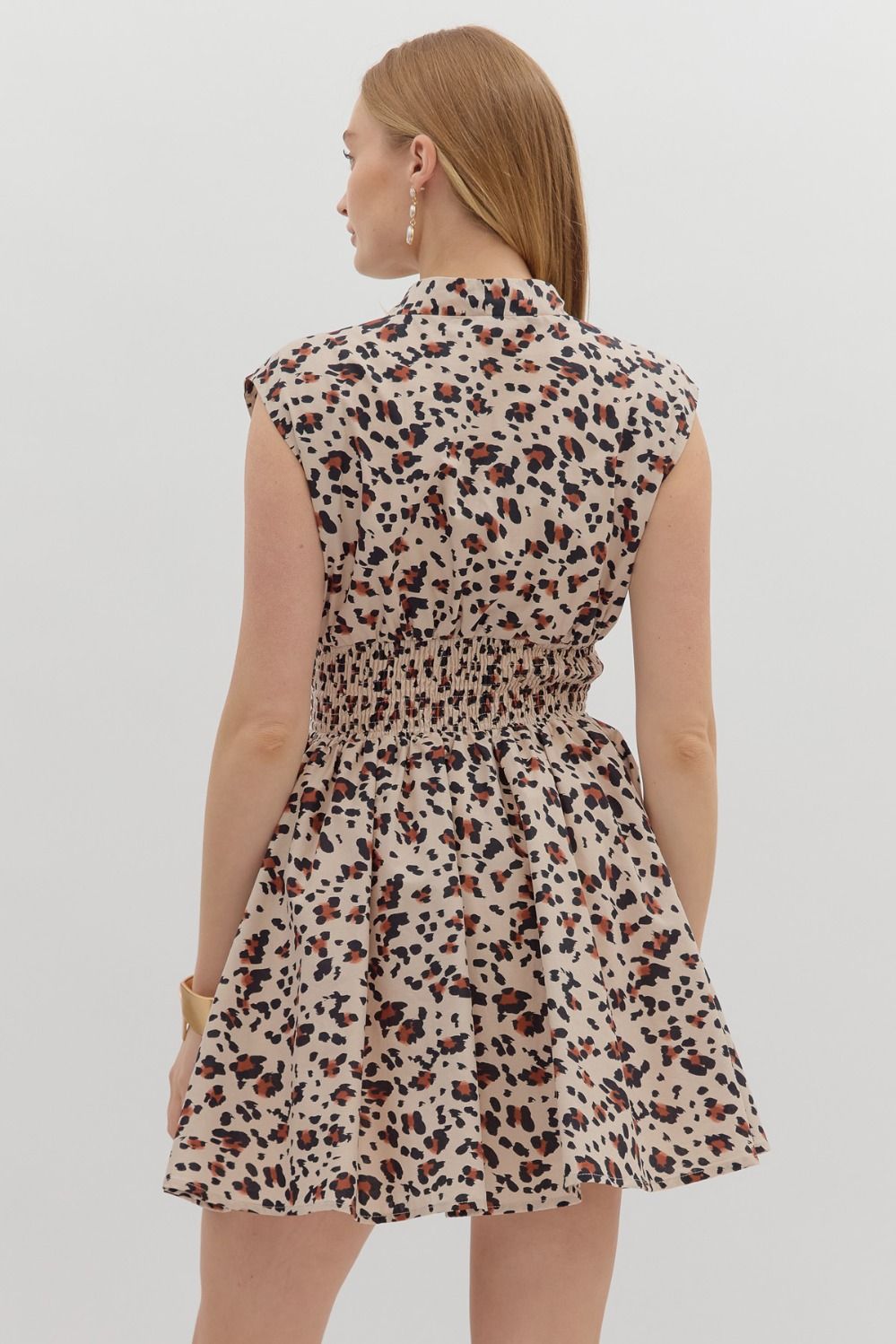 Leopard pattern V-neck sleeveless mini dress featuring zipper closure at front. Smocked waistband. Pocket at sides. Lined. Woven. Non-sheer. Lightweight