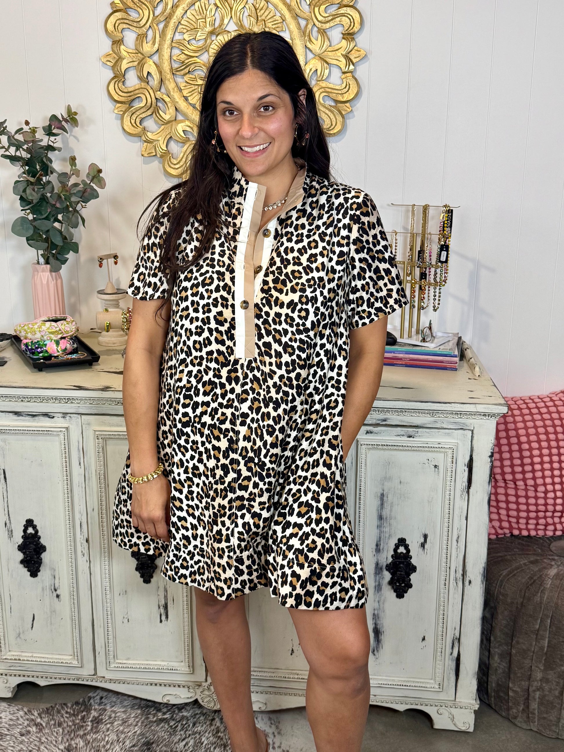 Unleash your fierce fashion sense with the Wild Side Polo Dress! This flirty, easygoing mini dress features an all-over leopard print that commands attention, while the neutral button-up polo collar and relaxed silhouette keep it effortlessly chic. Designed with subtle structure and side pockets for function-meets-style, it’s your go-to piece for brunch dates, casual events, or bossing your weekend errands.