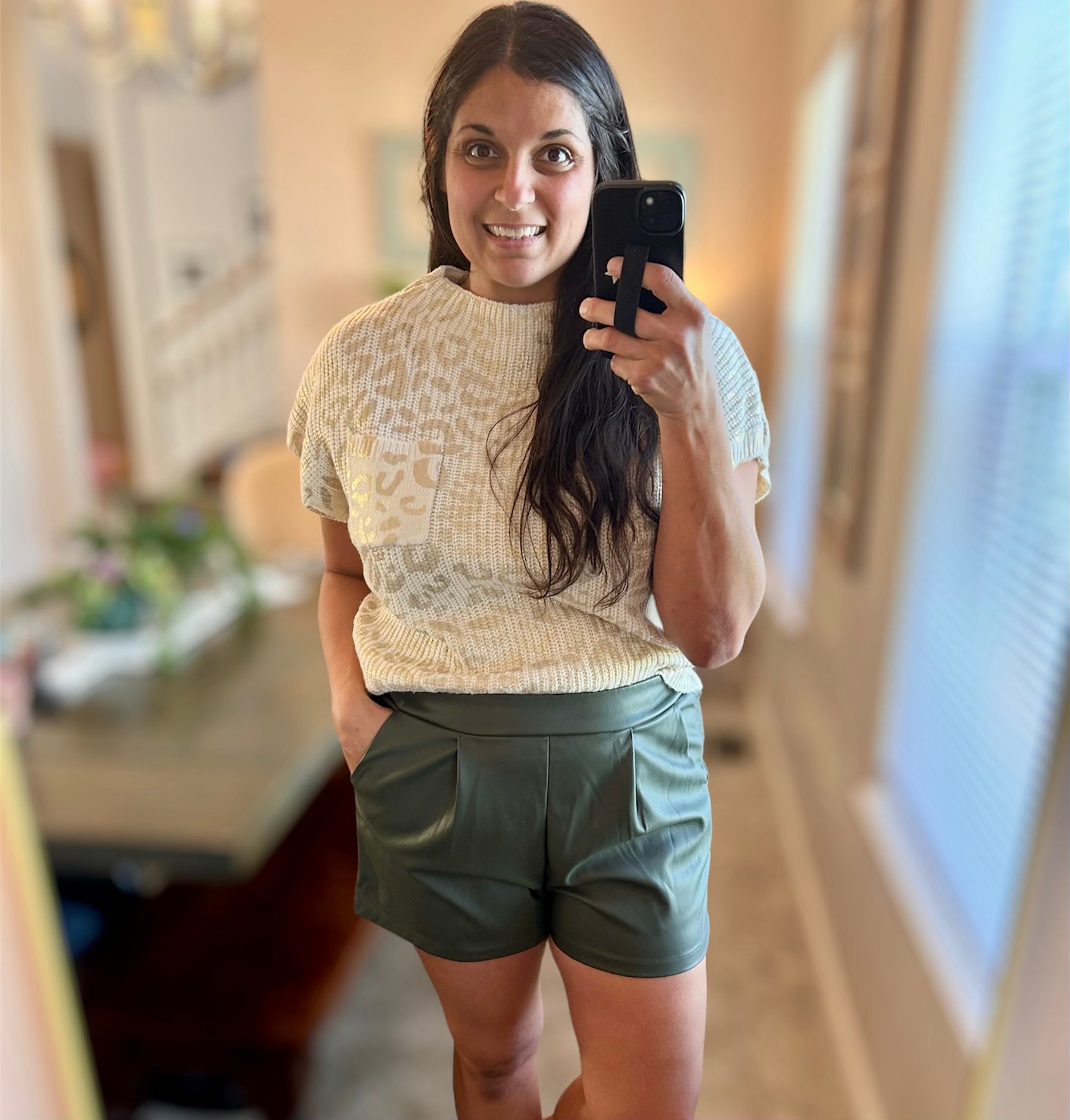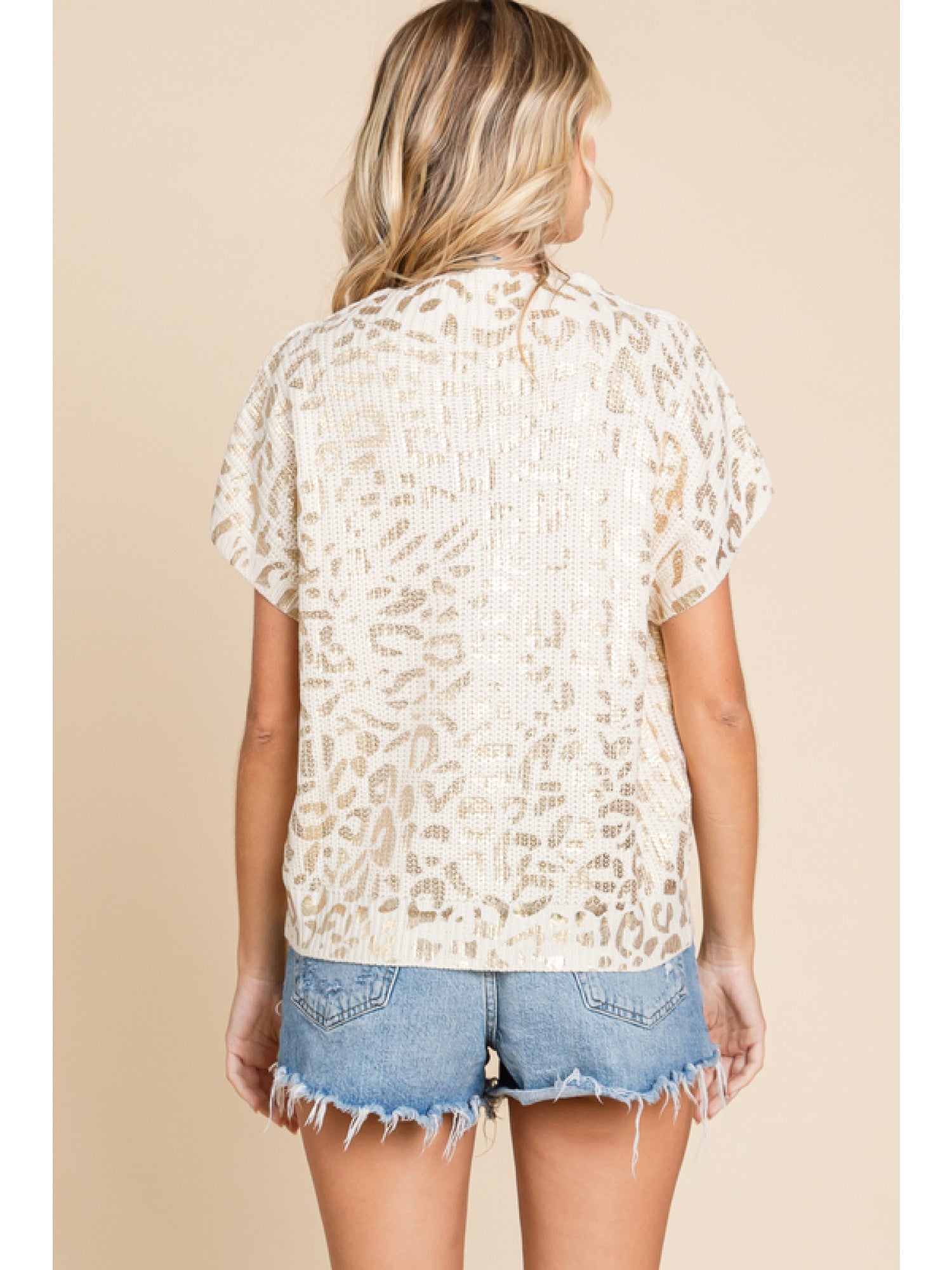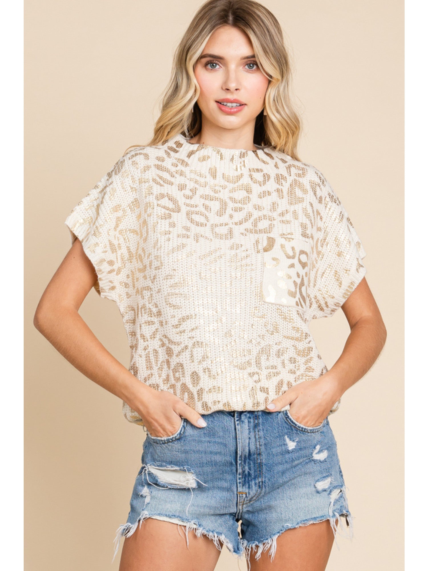 Metallic leopard print knit top with a mock neck, chest pockets, and short kimono sleeves.