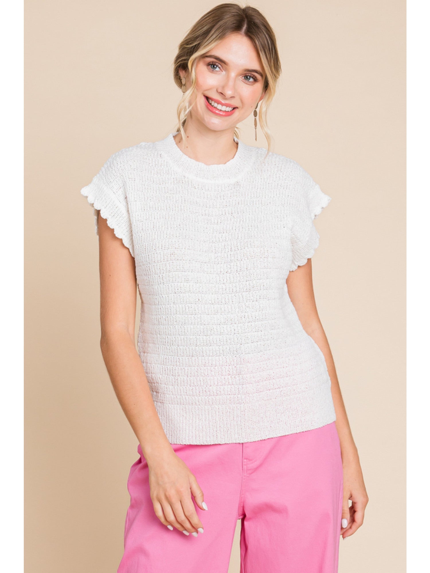 Textured knit top with crew neck, slay sleeves, and wavy cuffs. (Summer knit with a cool material) - Unlined, semi-sheer, lightweight.