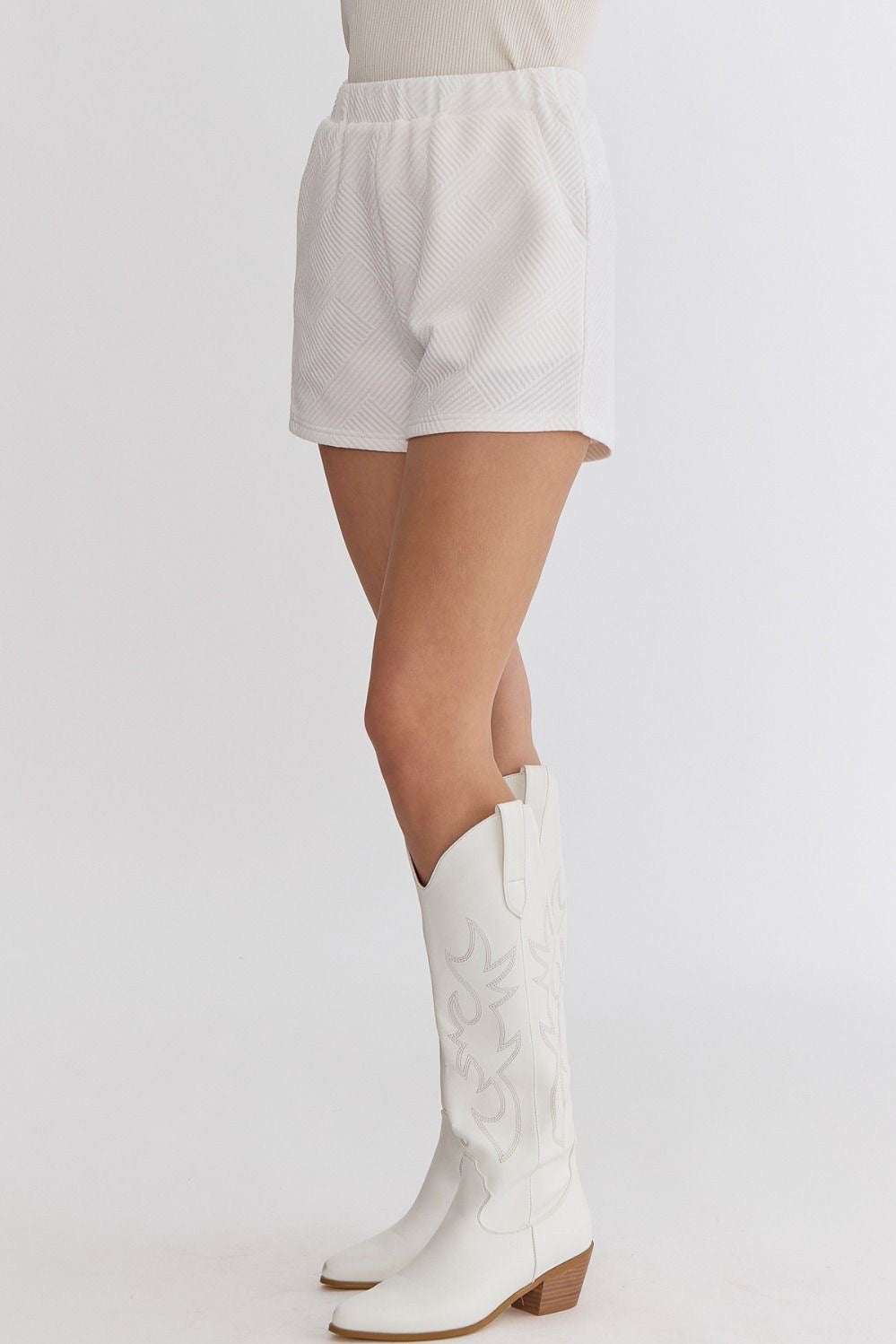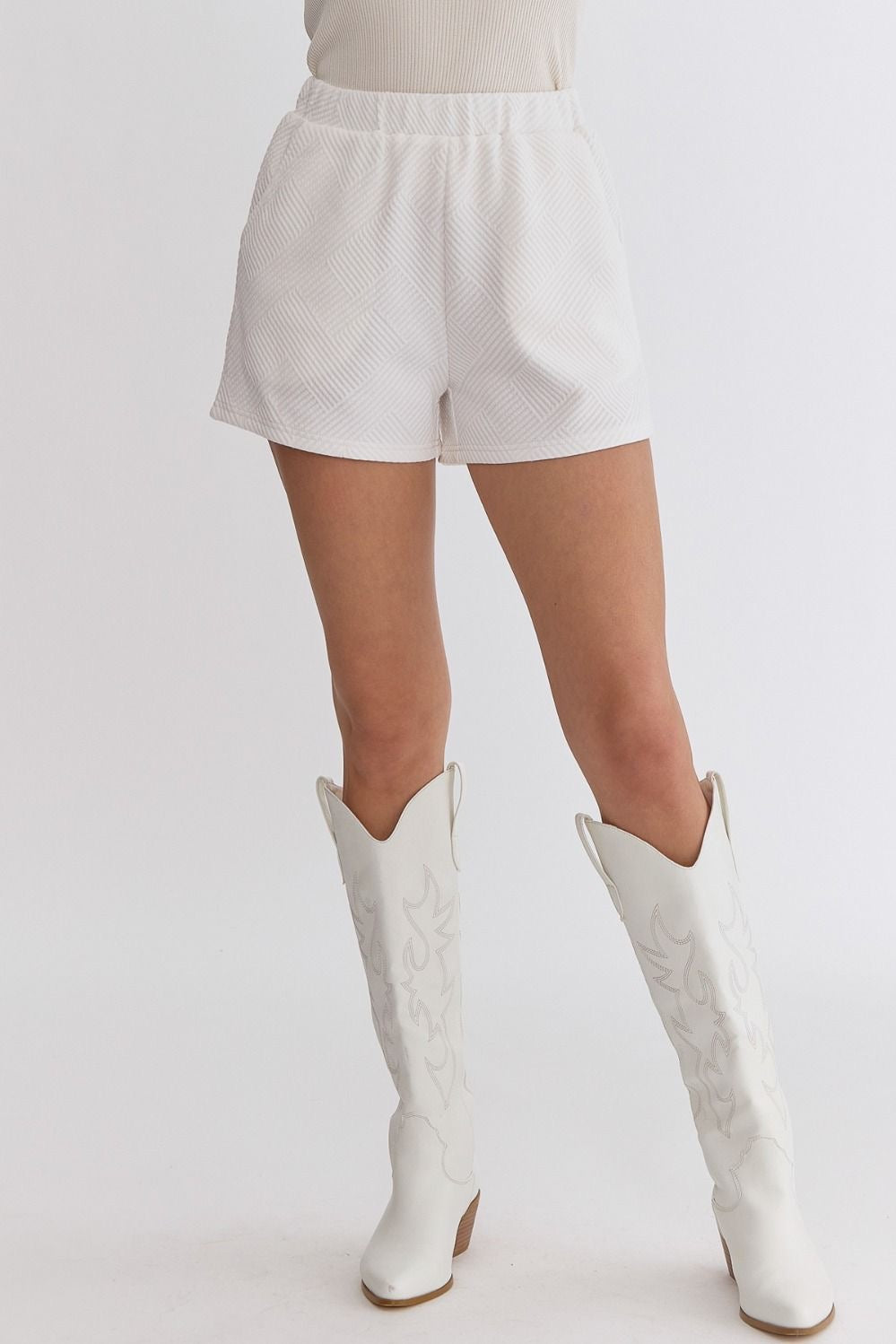 Textured high-waisted shorts featuring elastic waistband. Pockets at side. Unlined. Knit. Non-sheer. Lightweight.