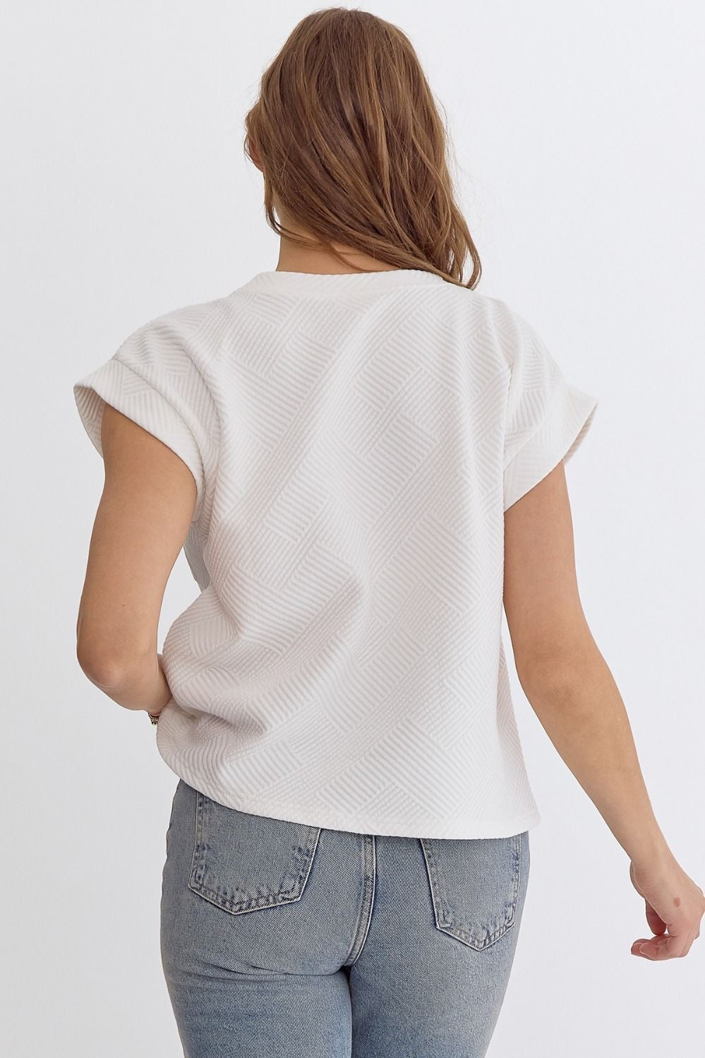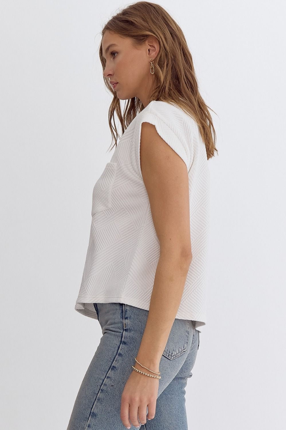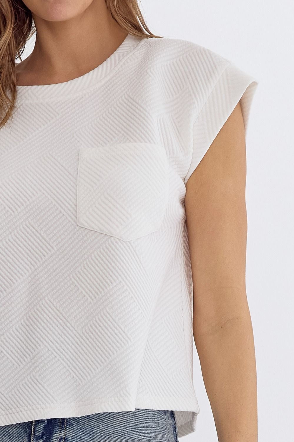 Textured round neck short sleeve cropped top featuring single pocket at bust. Unlined. Knit. Non-sheer. Lightweight.