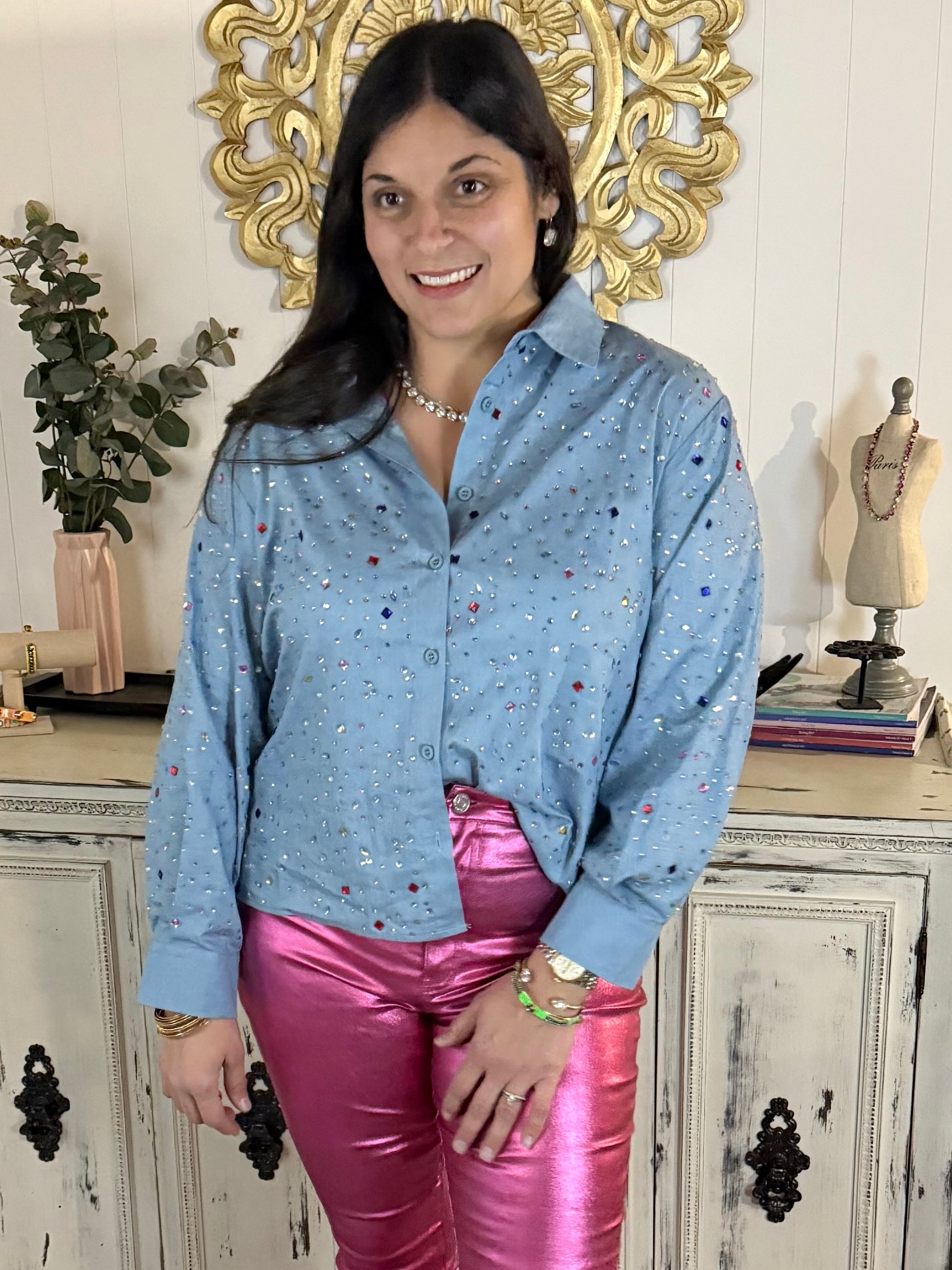 Meet the top that turns “just a button-down” into a full-blown moment. This chambray beauty is covered in multi-color gems that catch the light with every move—subtle shine, but still totally wearable.