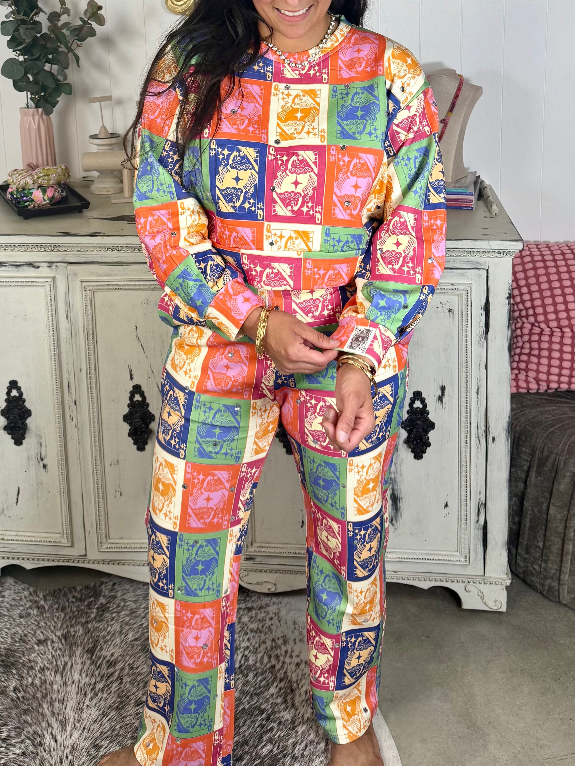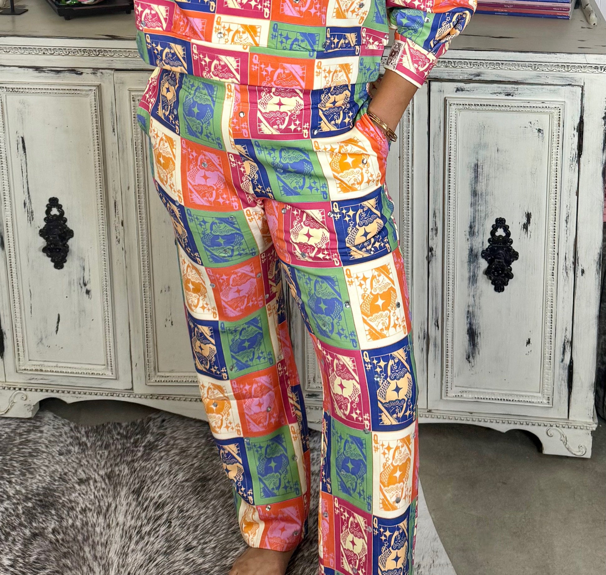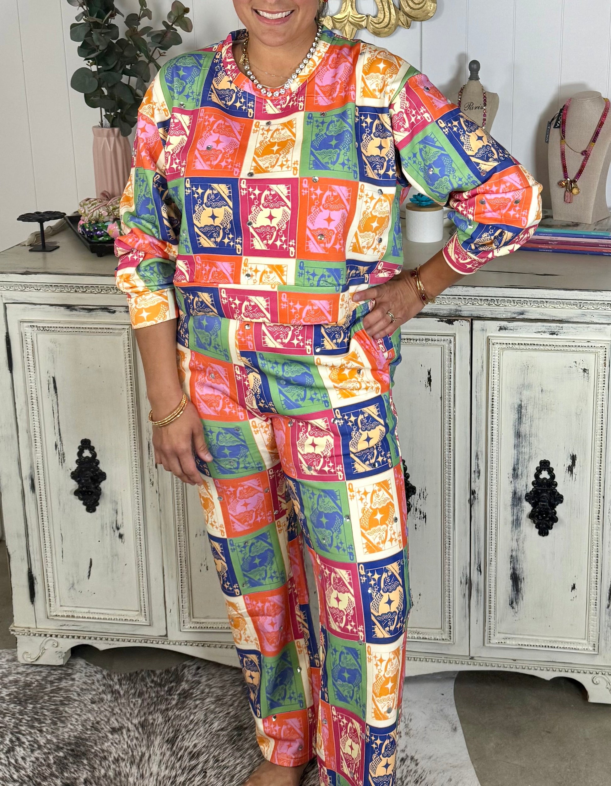 Play your fashion hand right in these dazzling straight-leg pants, bursting with bold Queen of Sparkles logo in a rainbow of jewel tones. Rhinestone accents add just the right amount of glimmer, while the comfy pull-on fit keeps it casual and cool.