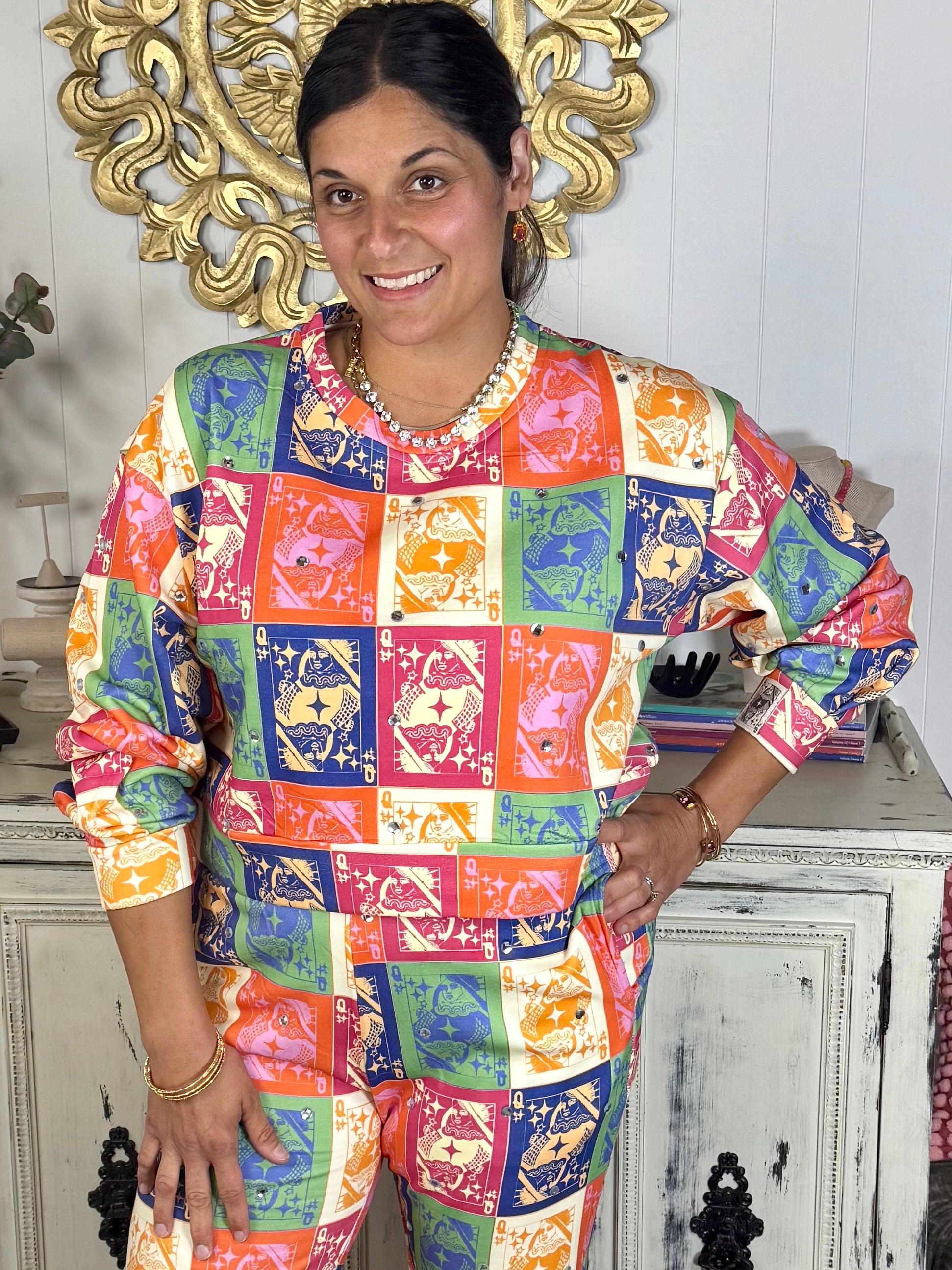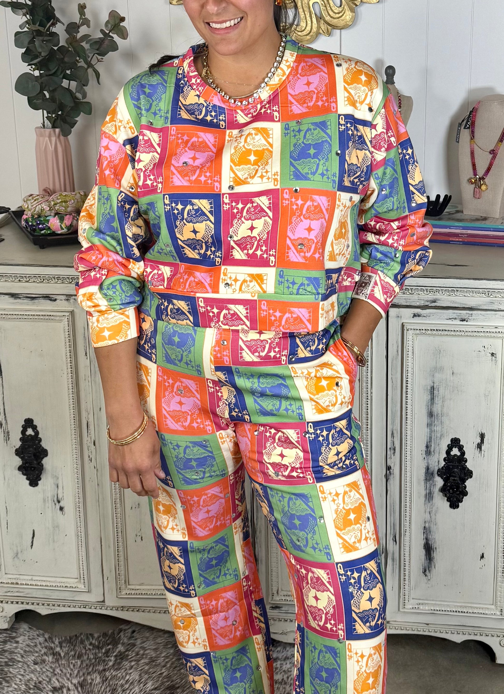 Make your move in this vibrant Queen of Cards pullover—bursting with bold jewel tones and playful card print blocks featuring a crowned queen silhouette. The relaxed fit, crew neckline, and subtle rhinestone embellishments give it that signature Queen of Sparkles flair. Perfect for stacking the deck in your favor—whether you're brunching, lounging, or stealing the show. Pair it with jeans or go full glam with the matching pants.
