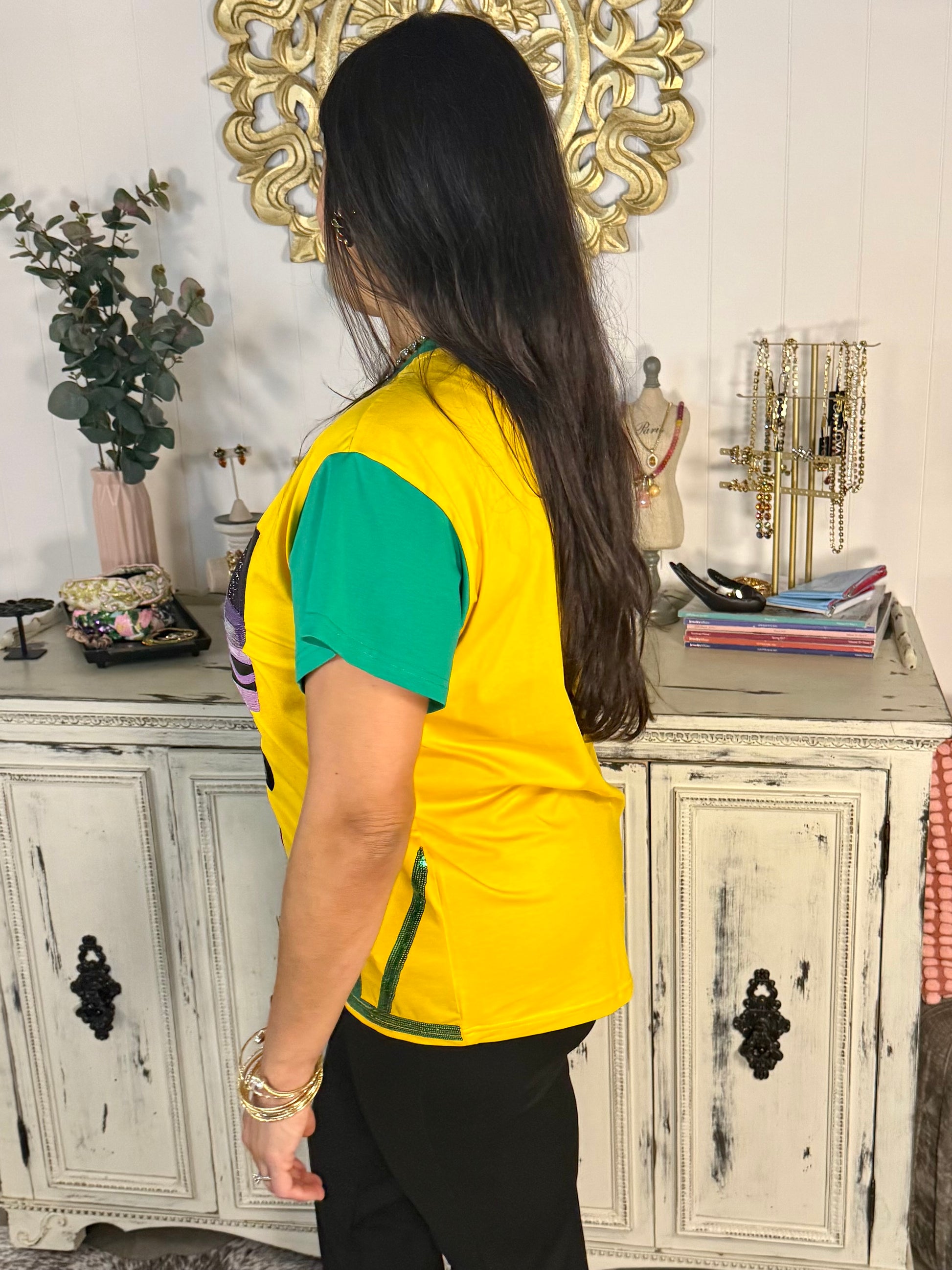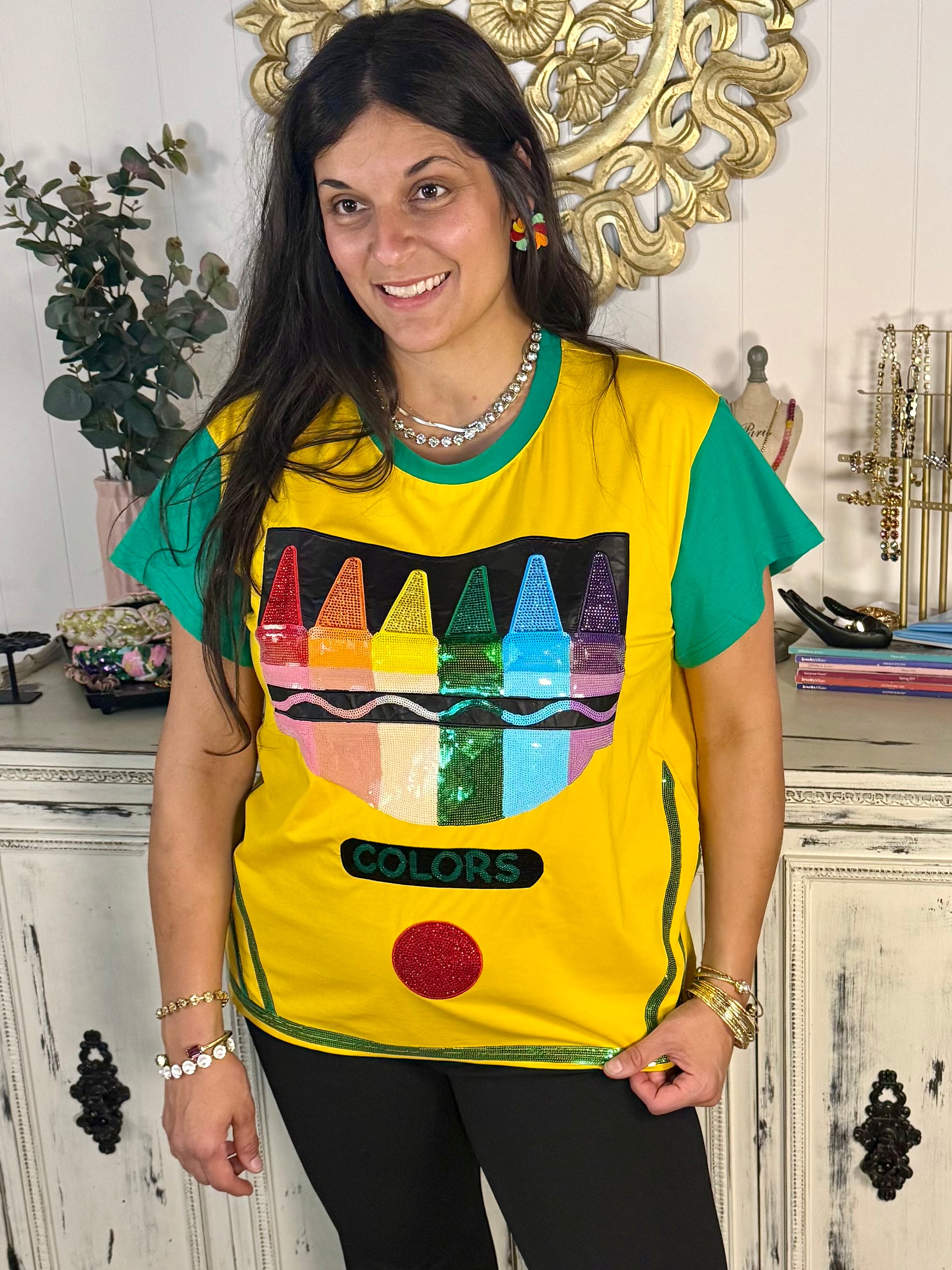 Add a burst of playful color to your wardrobe with the Queen of Sparkles Crayon Box Tee! This vibrant top features a whimsical crayon box graphic across the chest with a full rainbow of hues and bold “COLORS” text for extra flair. With a sunny yellow base, contrasting green sleeves, and angled green striping at the hem, this tee is a nostalgic nod to childhood creativity. Perfect for teachers, artists, or anyone who loves a pop of fun in their fashion. Made for statement-makers and sparkle lovers alike!