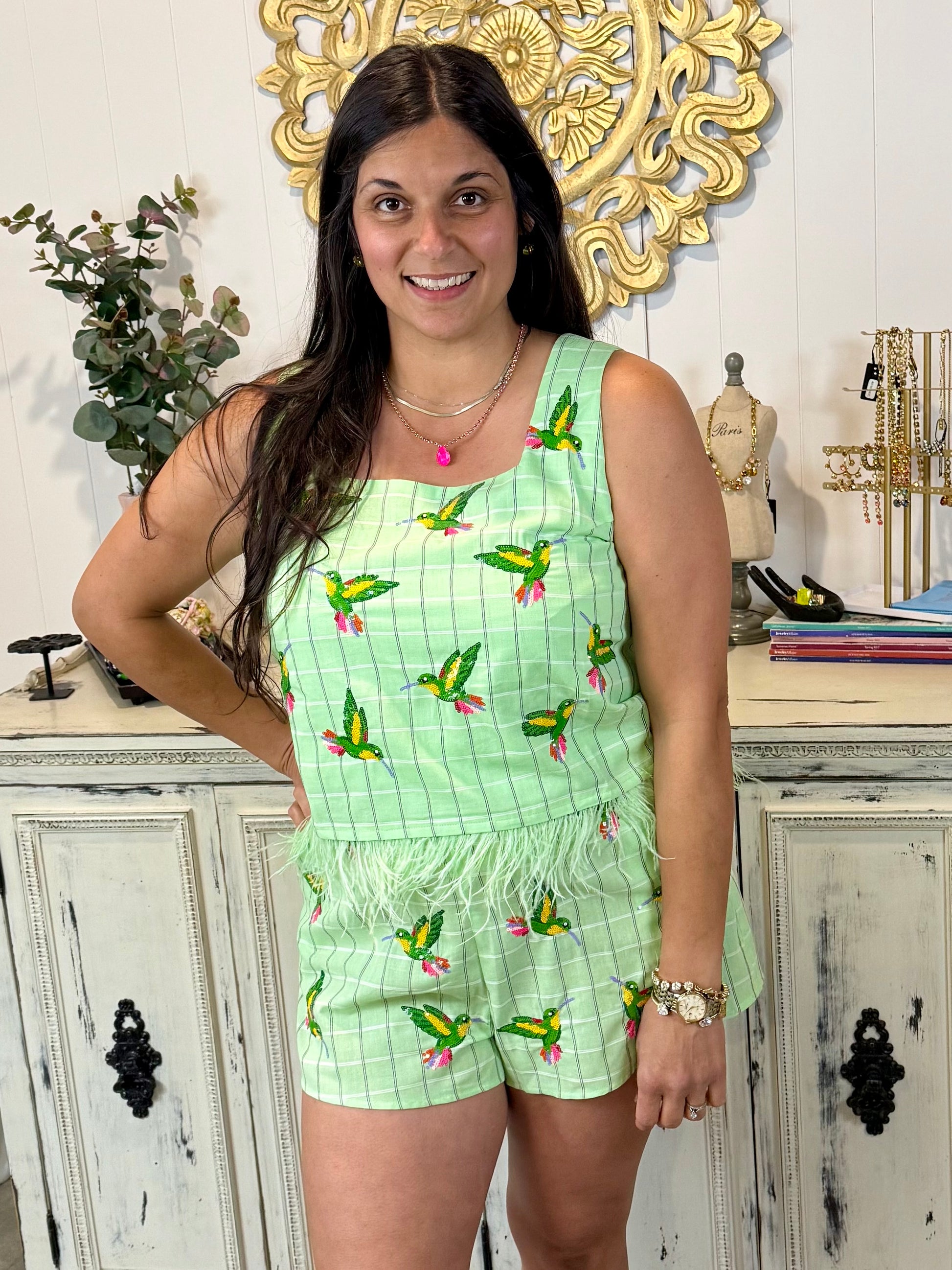 Queen of Sparkles Green Plaid Hummingbird Bird Short