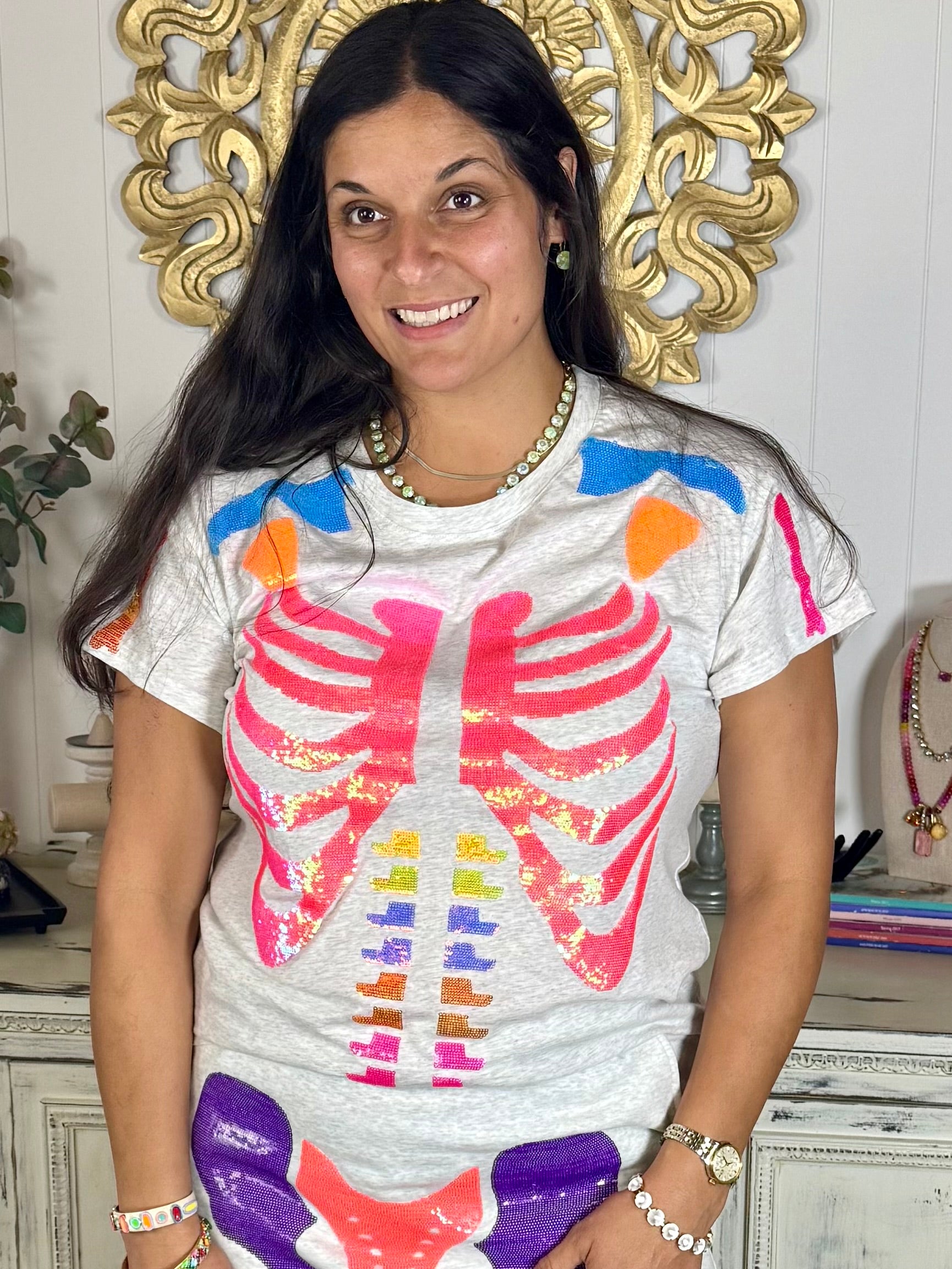 Who says spooky can’t be colorful? This soft gray tee is decked out with a full front rainbow sequin skeleton—bright pink ribs, multicolor spine, and vibrant shoulder bones bring the festive flair. It’s playful, bold, and totally extra in the best way. Style it with joggers for casual Halloween hangs or tuck it into a sequin skirt to party like a bone-afide babe.