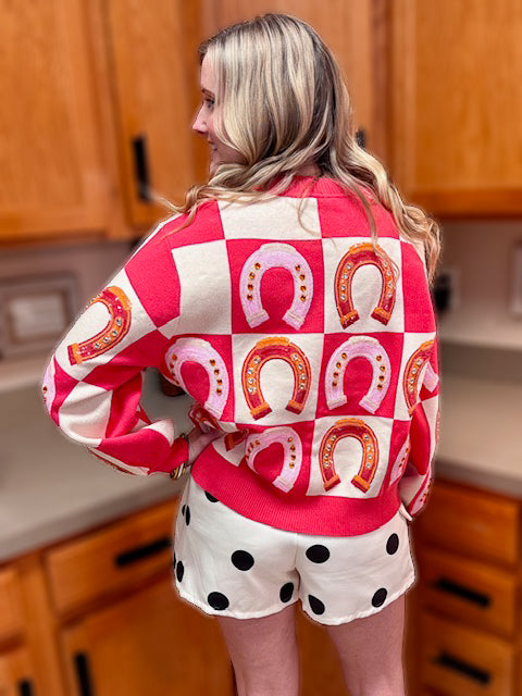 Queen of Sparkles Hot Pink Checkered Horse Shoe Sweater