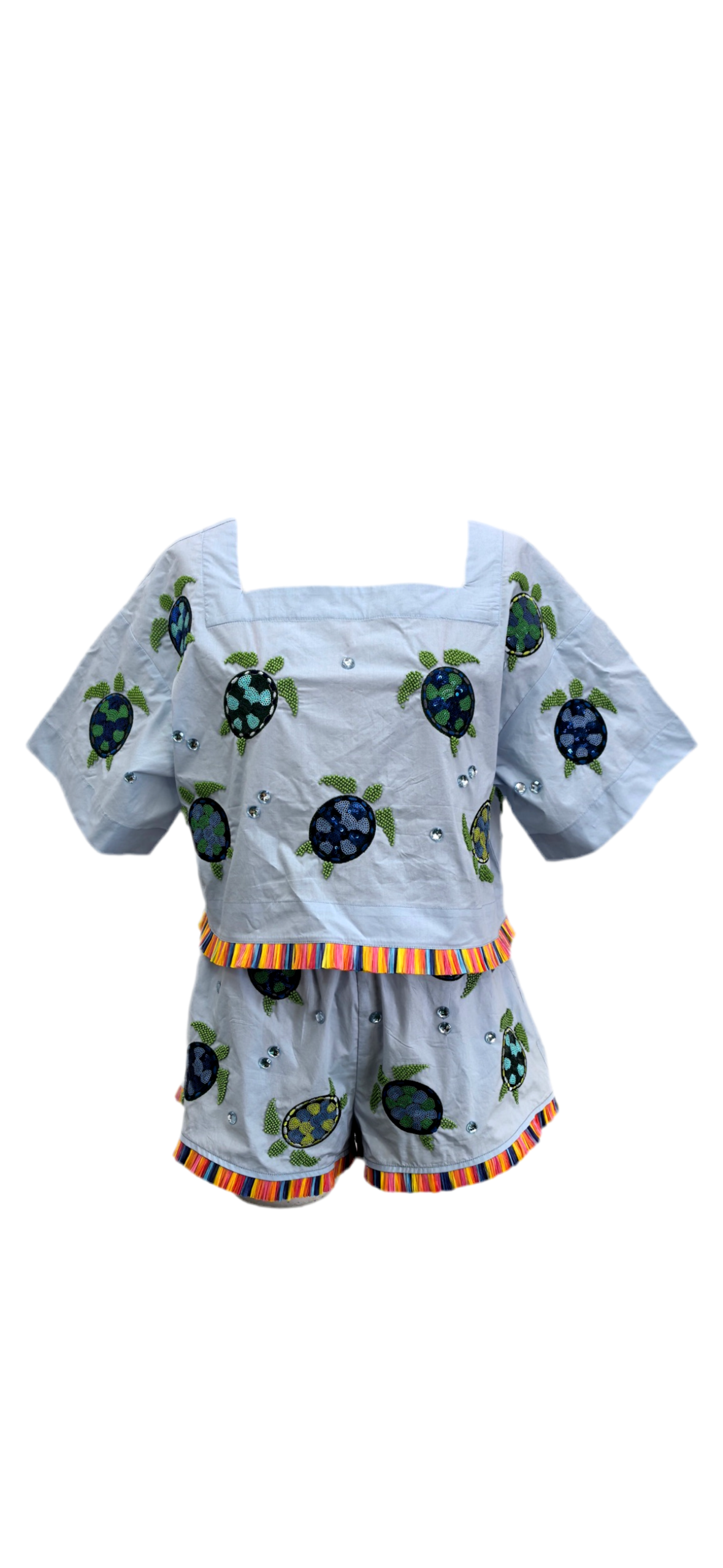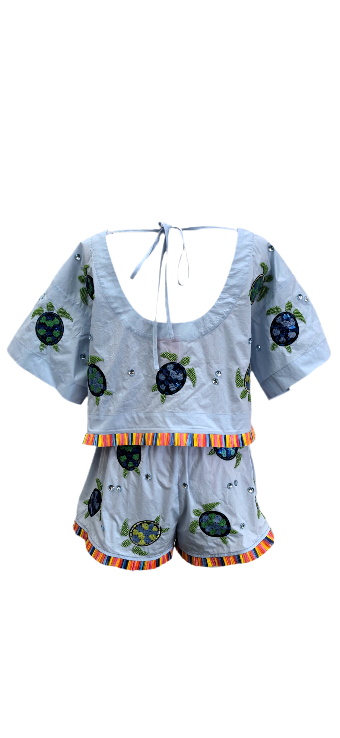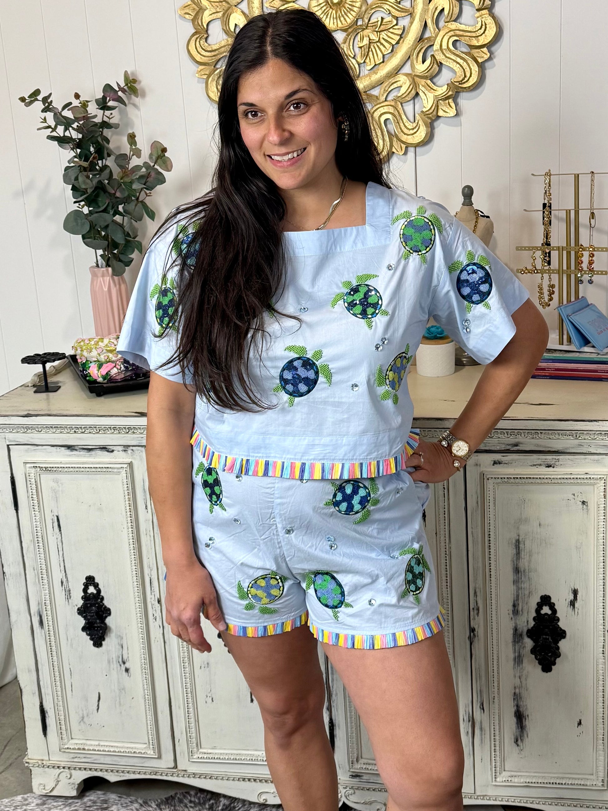 Queen of Sparkles Light Blue Turtle Fringe Short