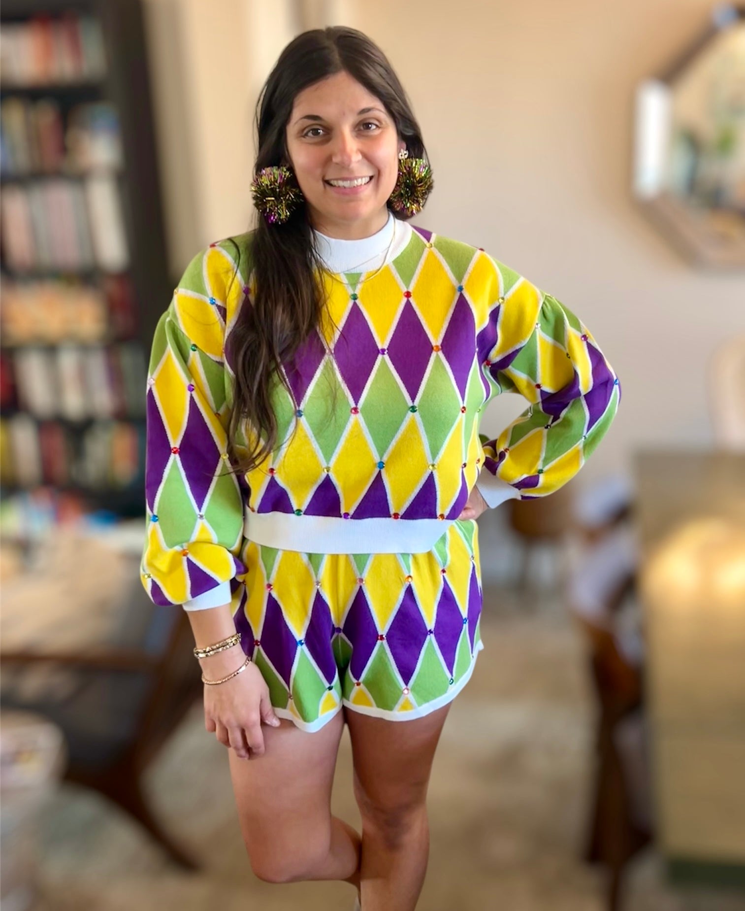 Queen of Sparkles Multi Mardi Gras Diamond Pattern Sweater
