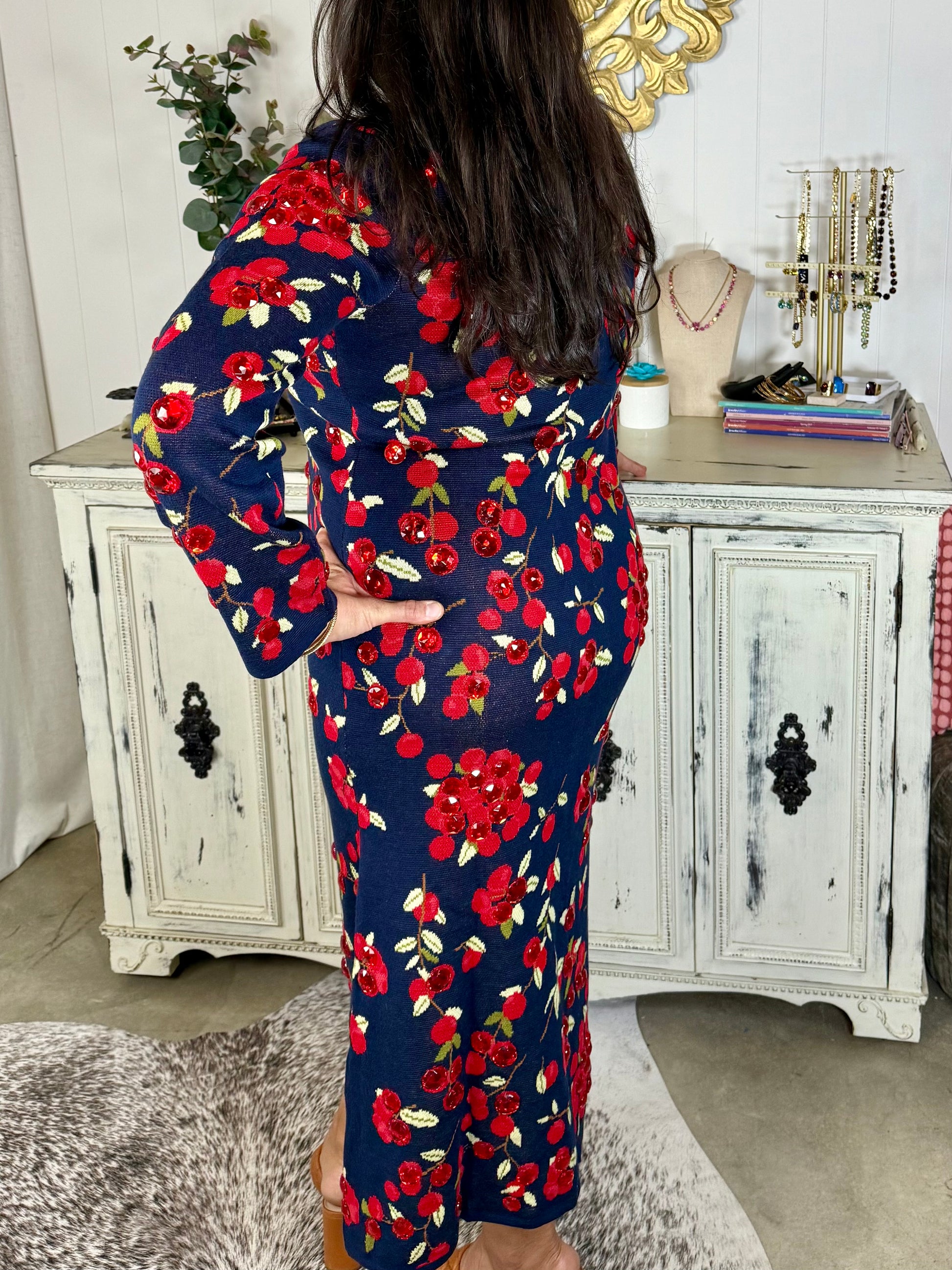 ✨ Details: Navy knit, all-over cranberry embroidery, oversized red sequin jewels