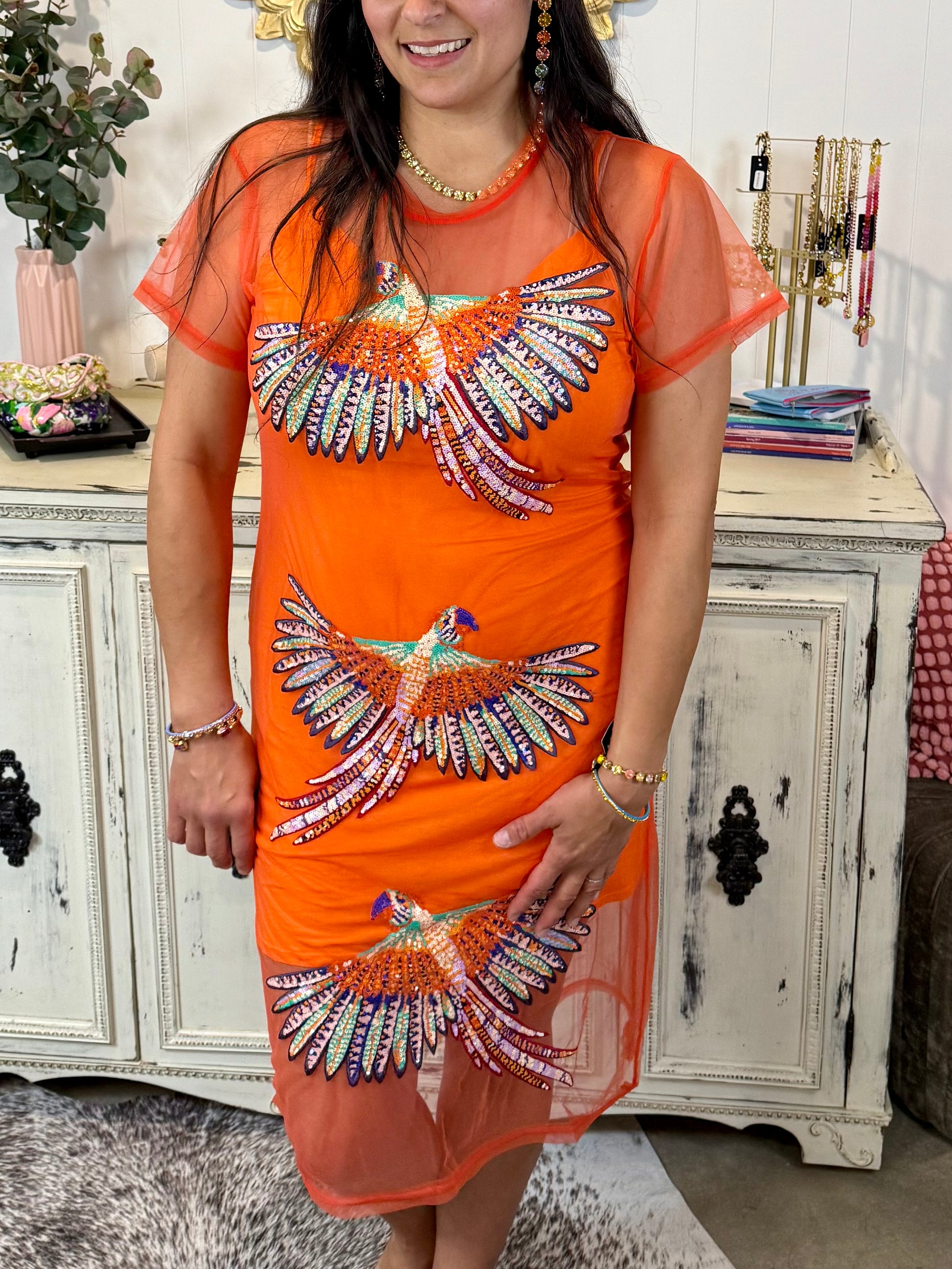 Queen of Sparkles Orange Colorful Bird Coverup Midi Dress