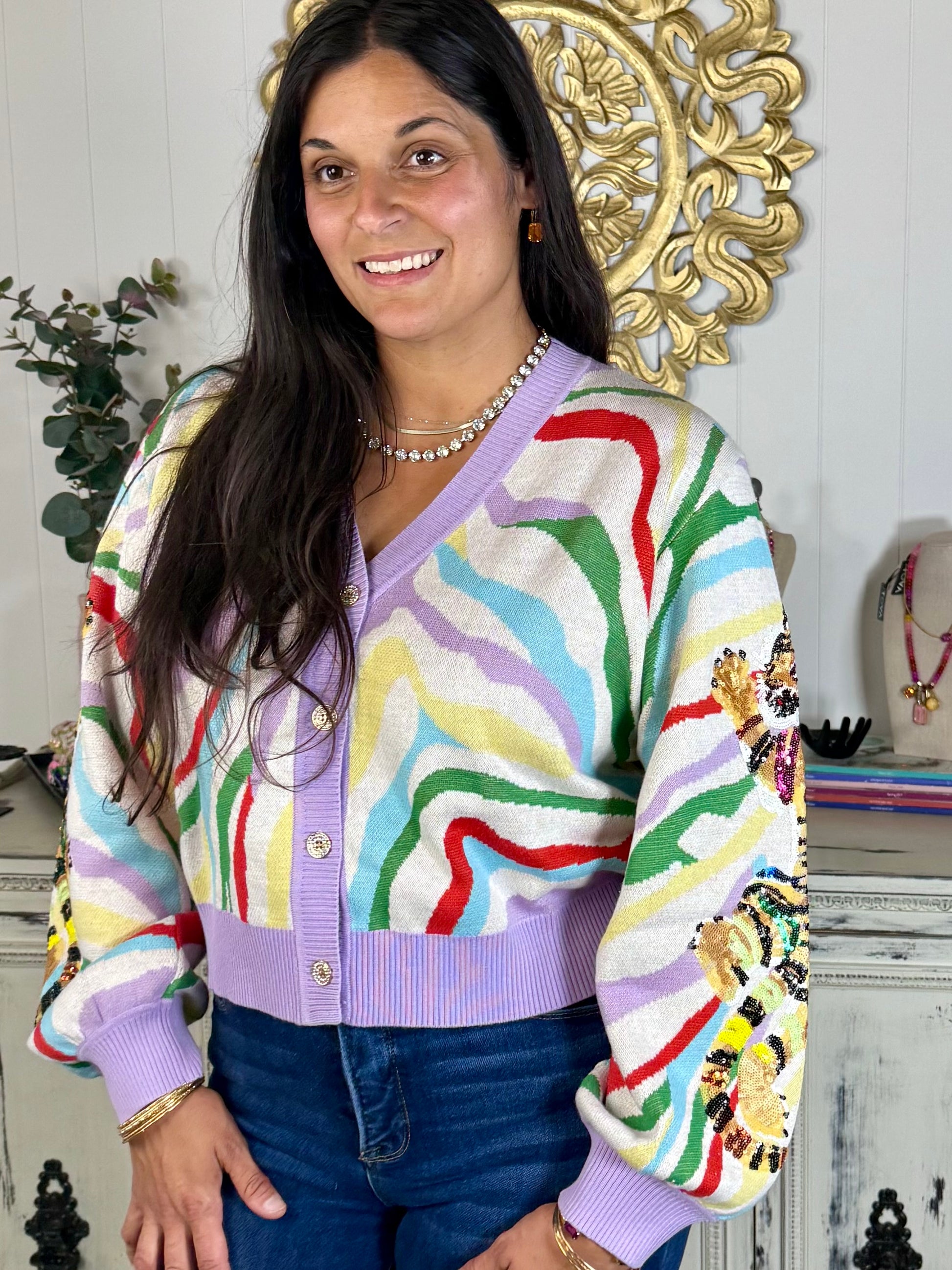 Unleash your colorful side with this bold and playful cardigan by Queen of Sparkles. A rainbow of stripes meets glittering sequin tigers on the sleeves, creating a vibrant statement piece full of personality. With lavender ribbed trim and dazzling crystal buttons, this sweater is perfect for anyone who wants to show off their wild side in the most stylish way. A true head-turner for festivals, tailgates, or everyday sparkle.