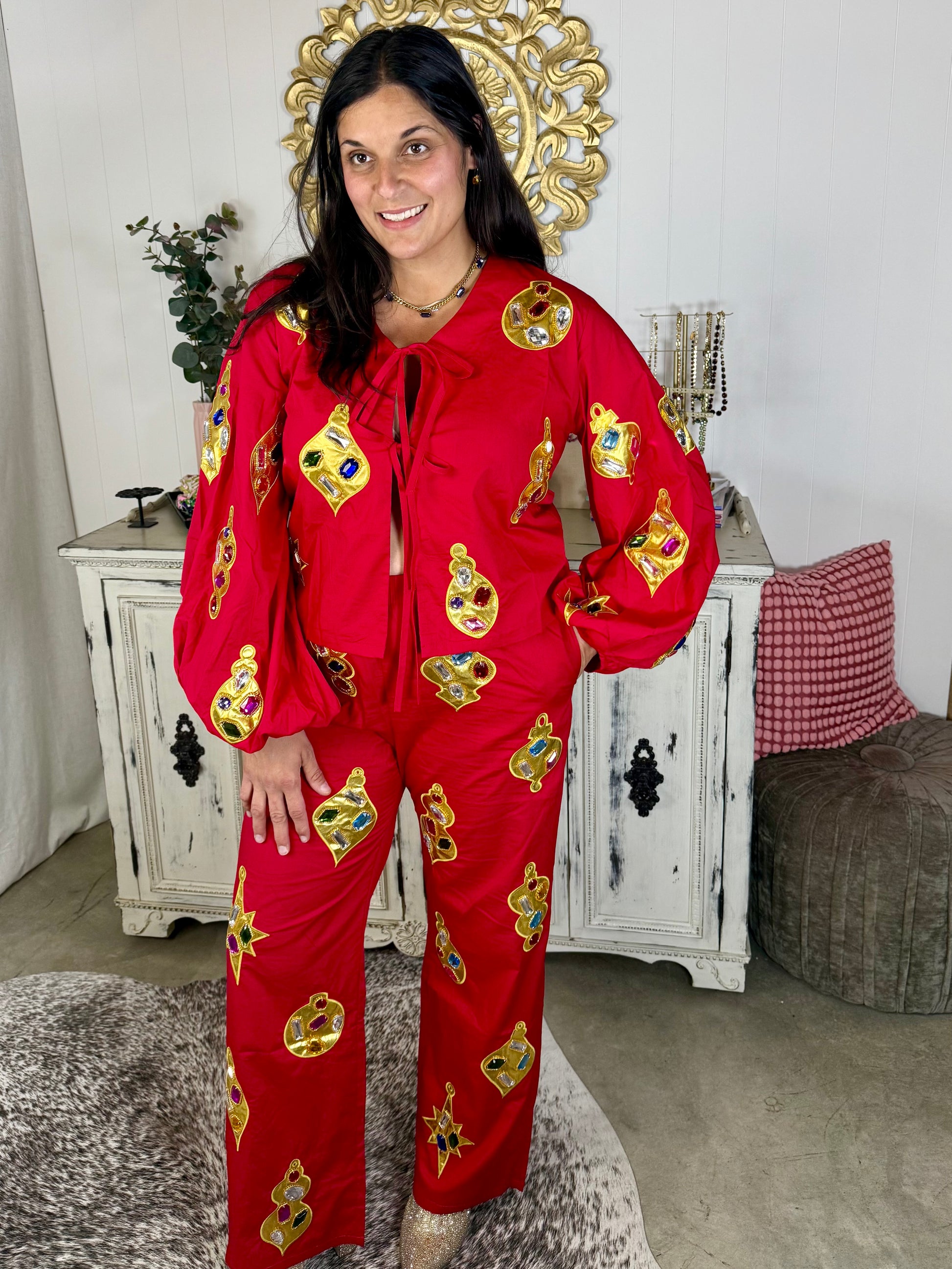 Festive from head to toe! These wide-leg red pants sparkle with oversized jeweled ornament appliqués for a one-of-a-kind holiday look. Comfy yet eye-catching, they’re the perfect pair to shine at holiday events.