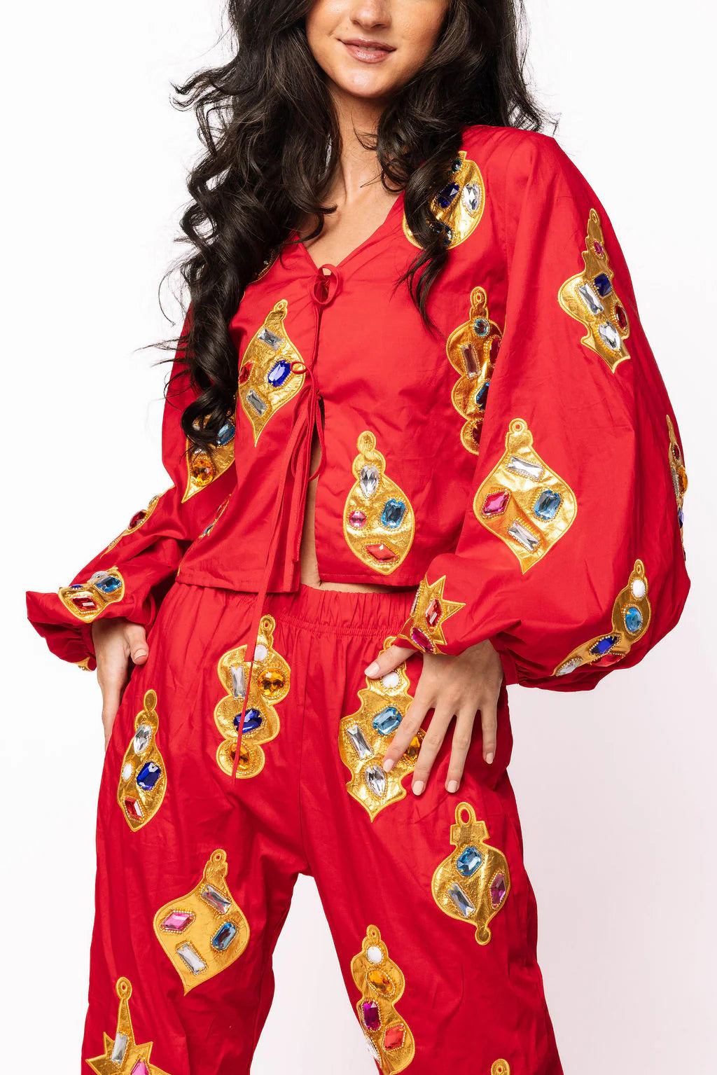 This bold red top is a holiday jewel — literally! Covered in oversized sequin and gem appliqué ornaments, it’s designed with tie-front details and dramatic balloon sleeves for a playful, sparkling twist.
