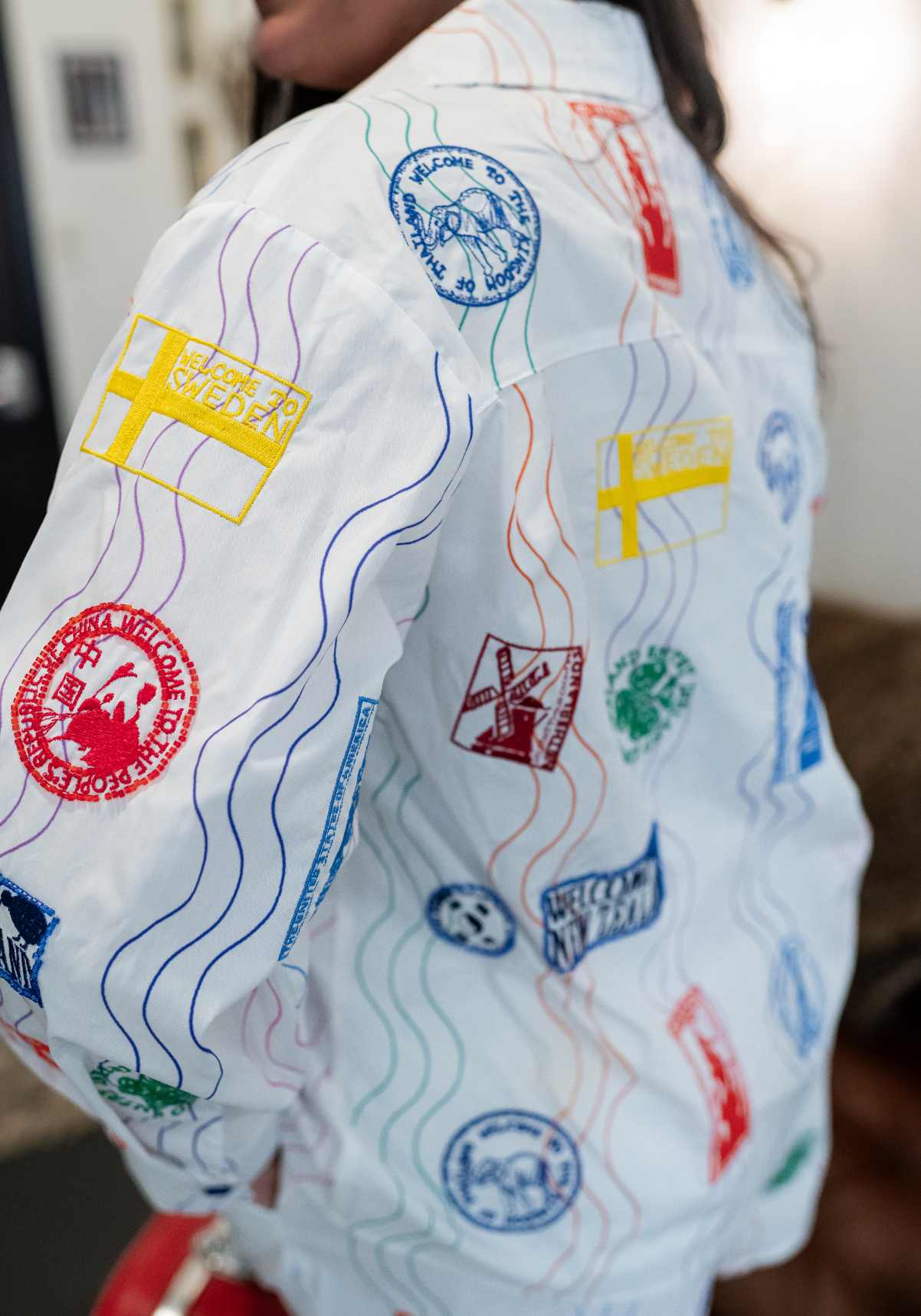 - White base with multicolor travel stamp print