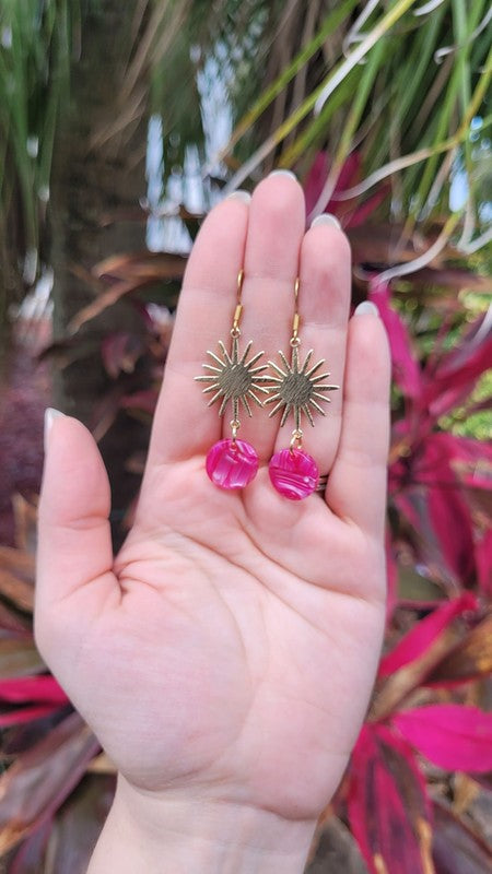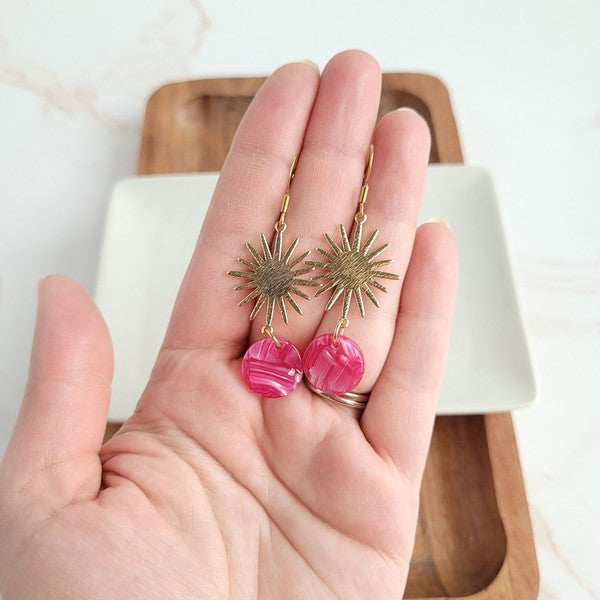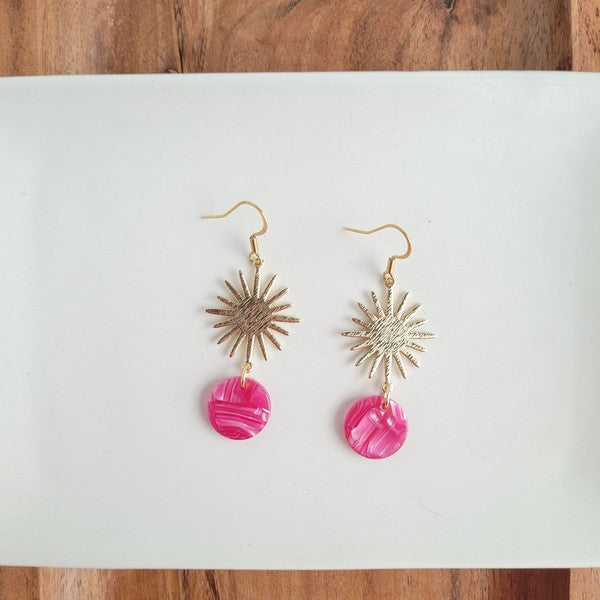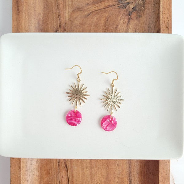 Let your style shine brightly with Solana Earrings! These eye-catching earrings feature a golden sunburst accented with a burst of colorful acrylic - perfect for adding a bit of sparkle to your day. Wear a little sunshine and show off your style!