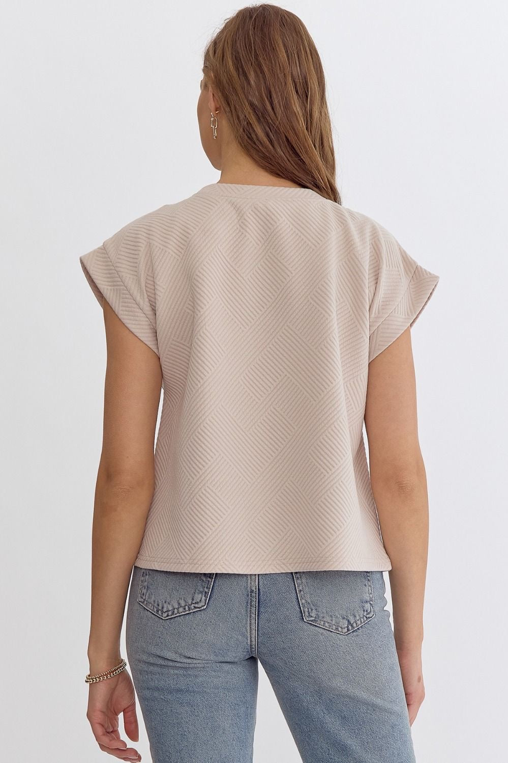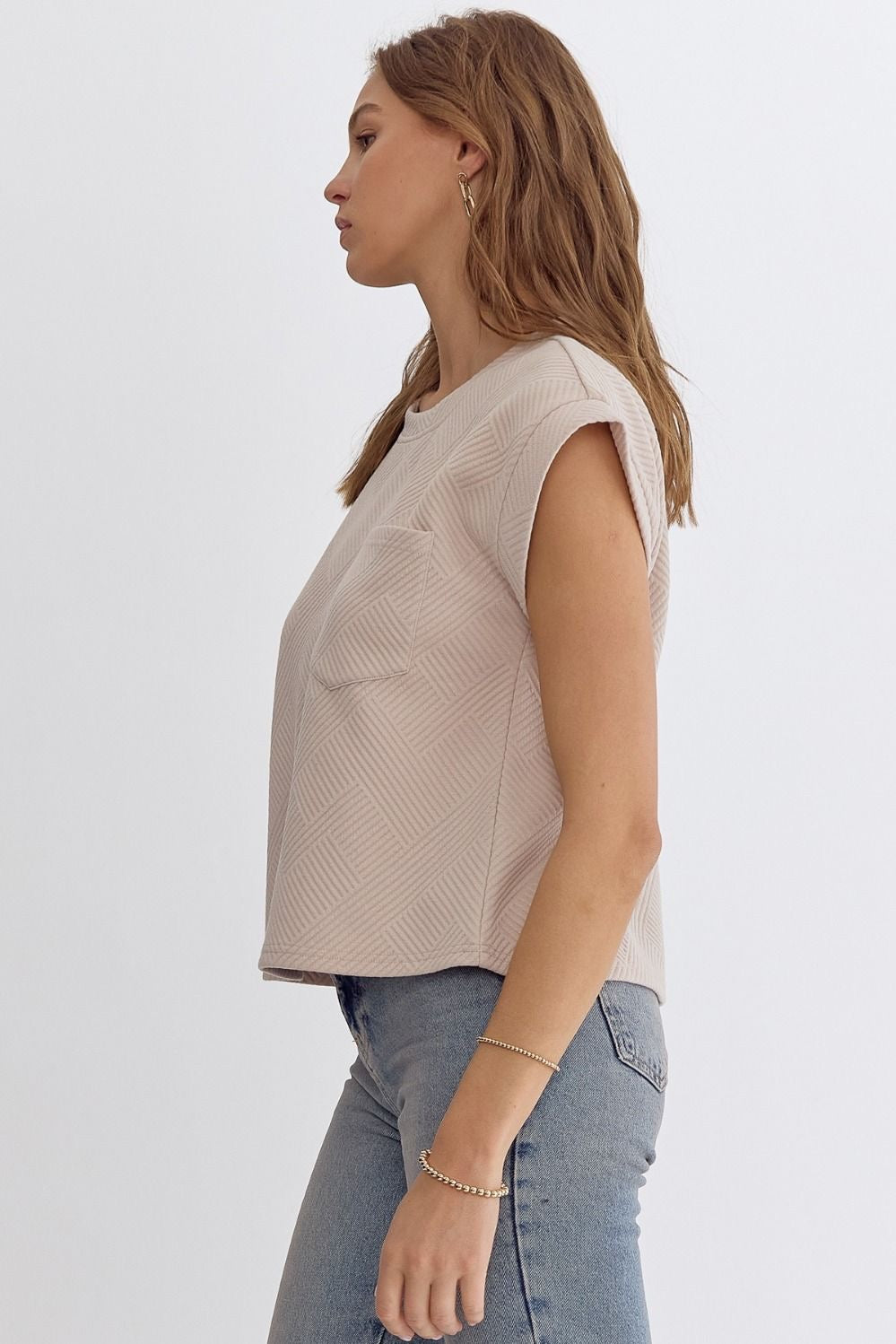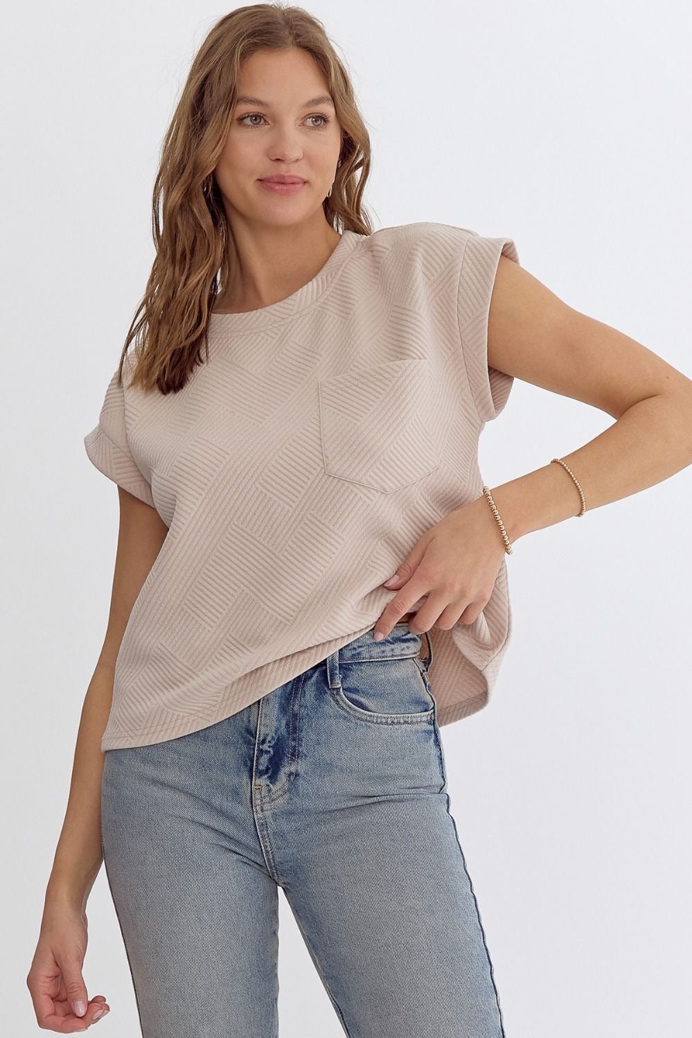 Textured round neck short sleeve cropped top featuring single pocket at bust. Unlined. Knit. Non-sheer. Lightweight.