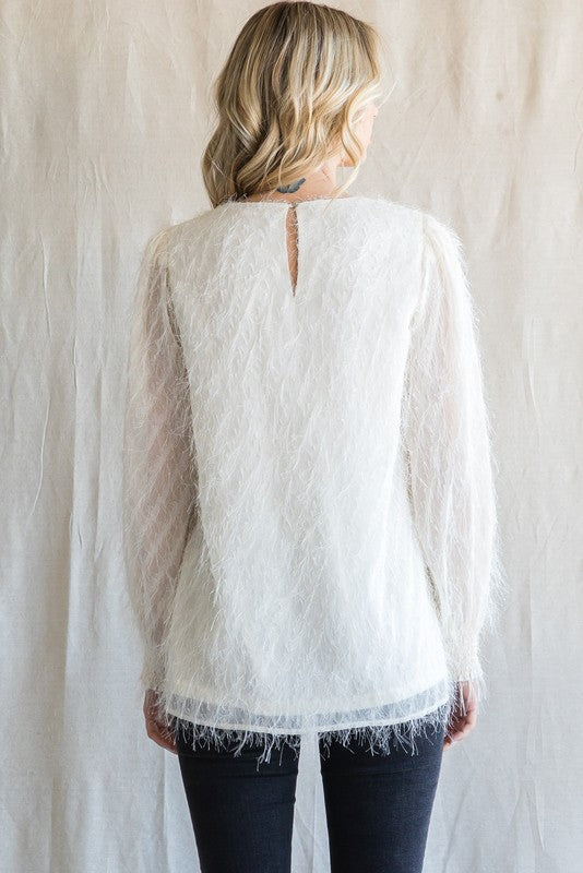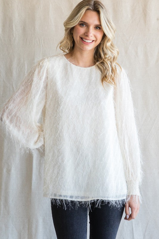 Textured top with a U-neck, back key hole, long bubble sleeves and smocked cuffs.