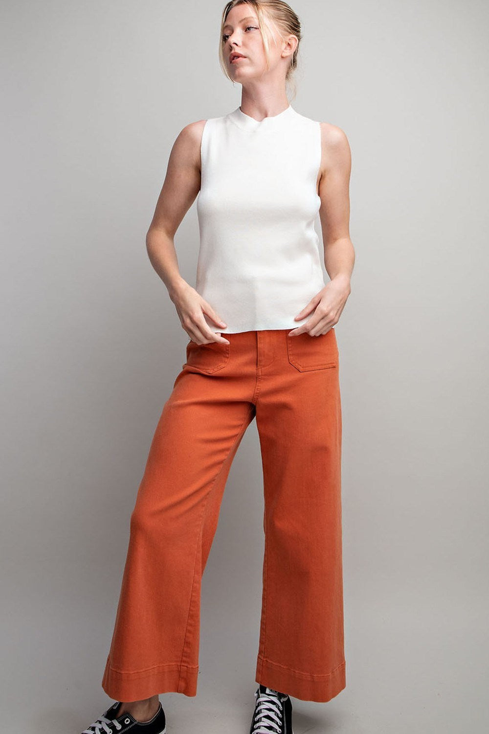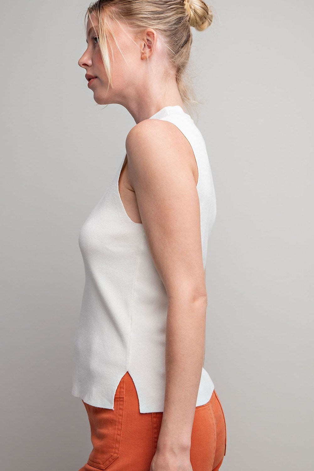 Classy fitted tank top made in a knit fabric with a mock neck.