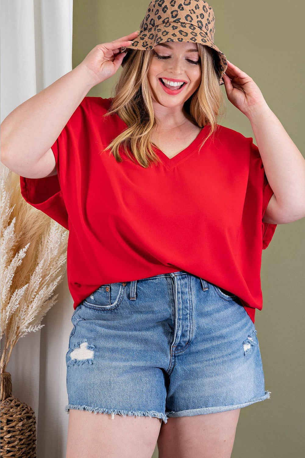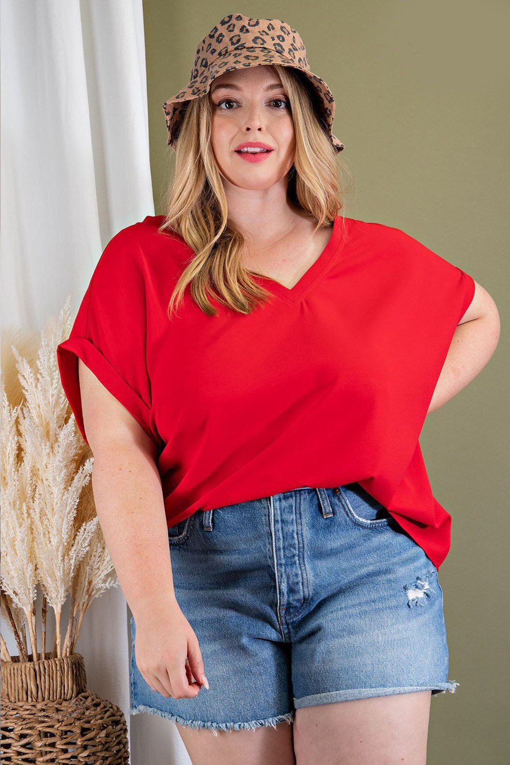 Solid woven top featuring a v-neck and cuffed short sleeves.